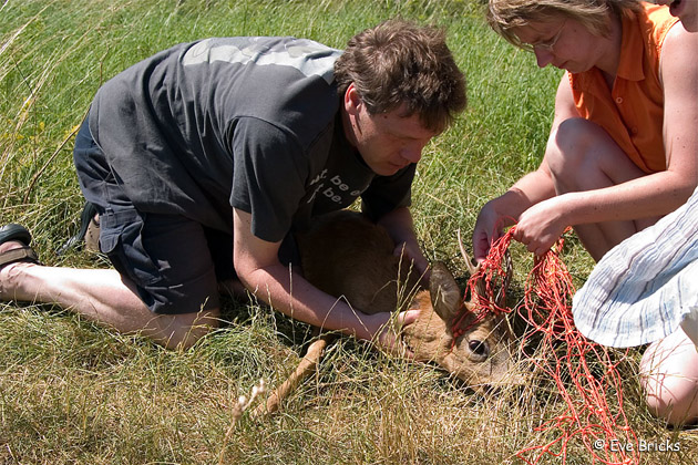 Weidezäune hingegen können für Rehe zu Fallen werden. Oft kommt es vor, dass sich Böcke mit dem Geweih darin verfangen und verenden, wenn sie nicht - wie in diesem Fall - befreit werden.