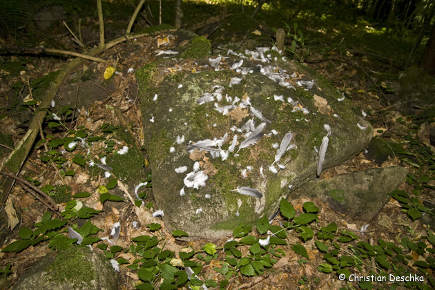 Viele Taubenfedern auf einem Stein oder Baumstumpf, ein weißer Kotstrich und vielleicht noch Beine und Schnabel - das sind die Überreiste einer Taubenmahlzeit von Habicht (oder Sperber).