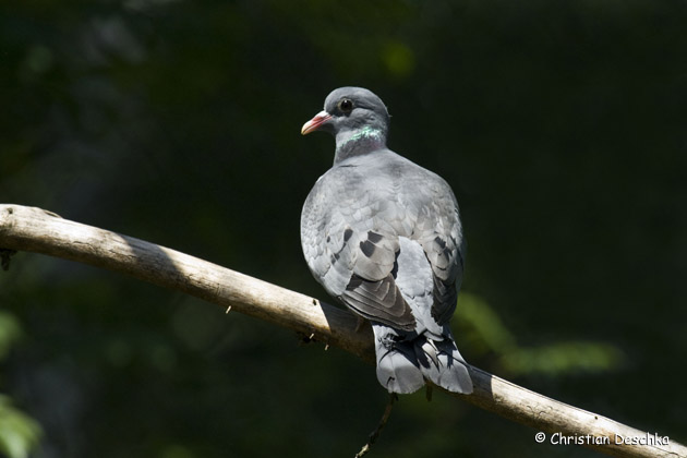 Die Hohltaube ist die seltenste unserer weitverbreiteten Wildtauben. Im Vergleich zur Ringeltaube ist sie deutlich kleiner und kompakter. Sie hat keinen weißen Halsfleck, dafür zwei scharze Flecken am Flügel. Das gesamte Auge ist dunkelbraun. |