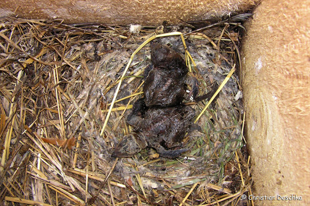 Auch Jungvögel können im Nistkasten sterben. Zumeist handelt es sich um späte Bruten, die vermutlich von ihren Eltern verlassen werden, da sie durch deren Aufzucht das eigene Leben aufs Spiel setzen würden.