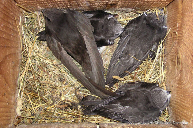 | Beobachtungskolonien wären beispielsweise in Schulen eine tolle Möglichkeit, um Kindern unsere gefiederten Freunde näherzubringen. Hier sieht man wiederum links oben einen bräunlichen Altvogel und drei dunklere Jungvögel mit weißen Federrändern. |