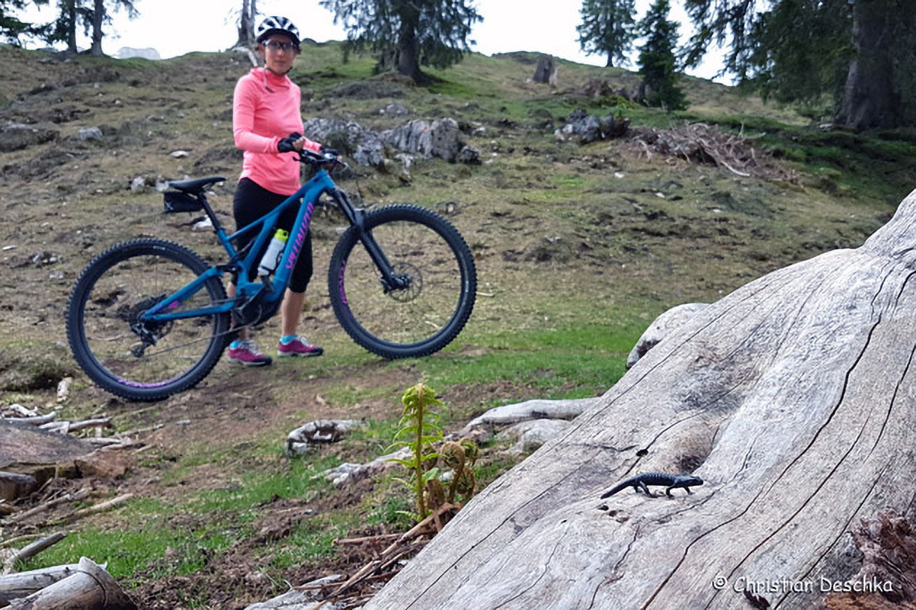 Wer beim Mountainbiken mit offenen Augen unterwegs ist, kann dem Alpensalamander regelmäßig begegnen.
