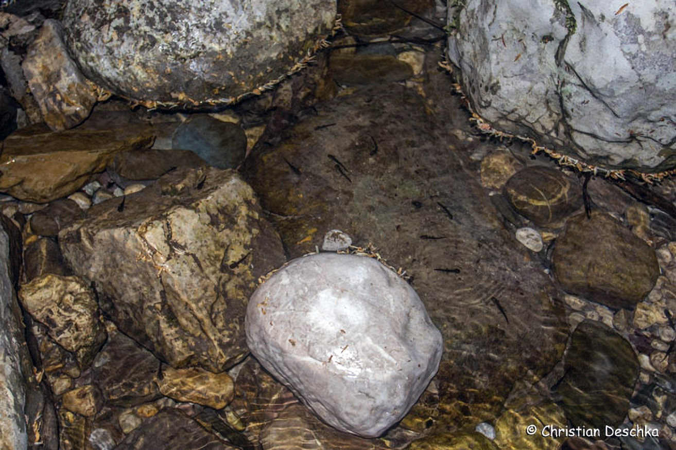 Macht man sich aktiv auf die Suche nach Alpensalamandern, kann man tagsüber z.B. unter hohl liegenden Brettern und Steinen fündig werden.
