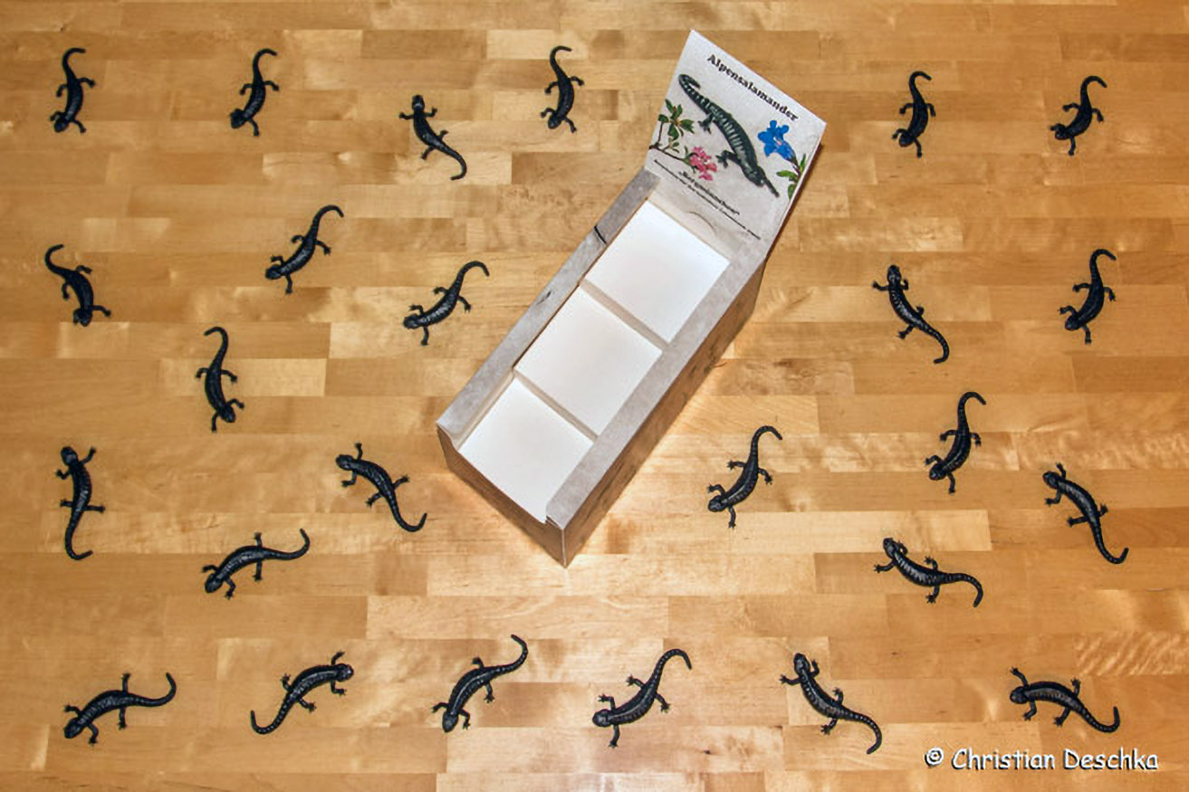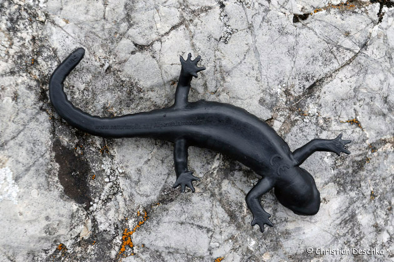 Der Schriftzug www.naturimbild.at/Alpensalamander am Bauch der Modelle verweist auf den Alpensalamanderbeitrag auf dieser Internetseite. Der online-Vortrag vermittelt Wissenswertes über Lebensweise, Gefährdung und Schutz des "Bergmännchens".