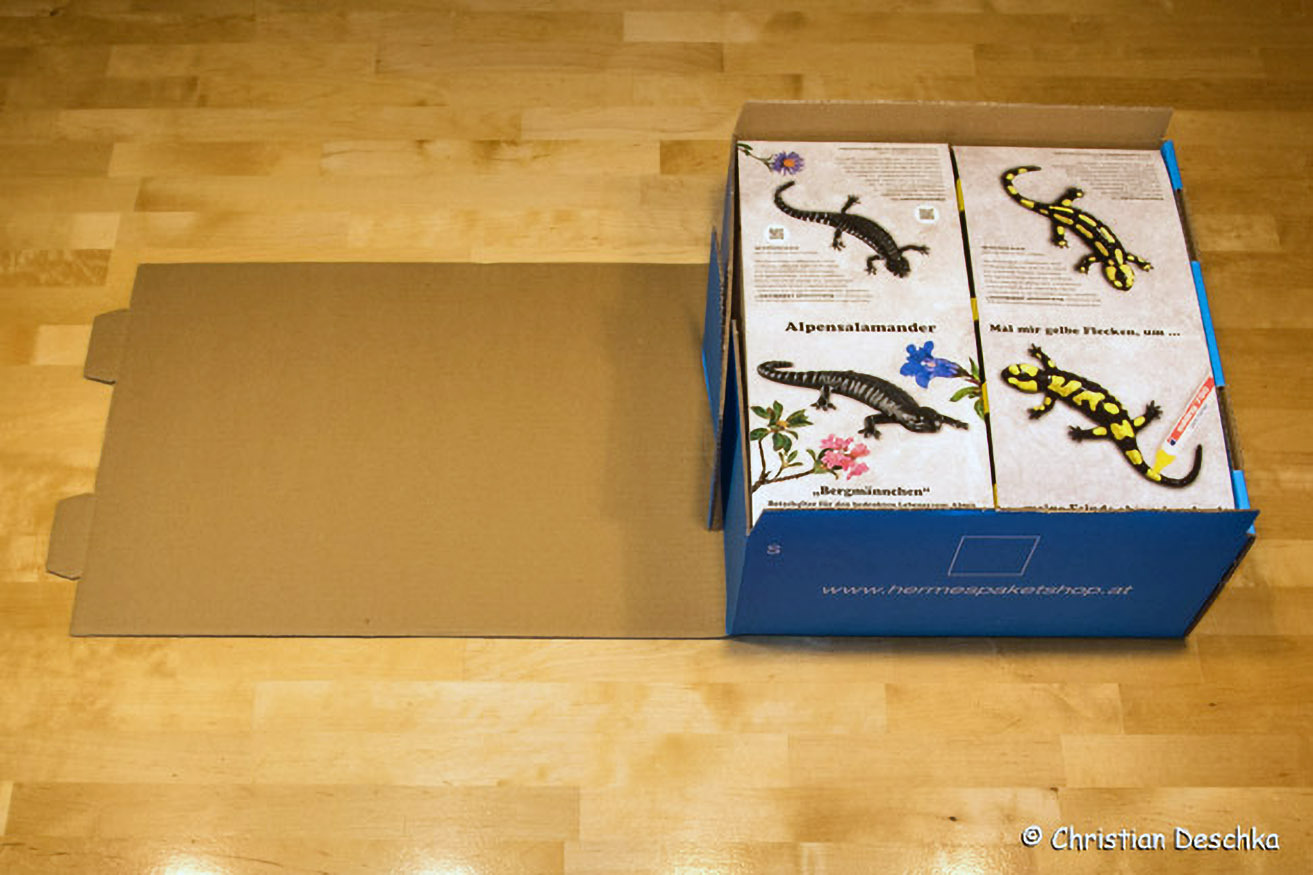 Um 5 € Porto können zwei Alpensalamander-Displayboxen bzw. eine Feuer- und eine Alpensalamanderdisplaybox in einem Hermes-Versandkarton Größe S verschickt werden. Die Versandkosten nach Deutschland betragen 10 €, bei ca. 2 Wochen Vorlaufzeit ebenfalls 5 €.