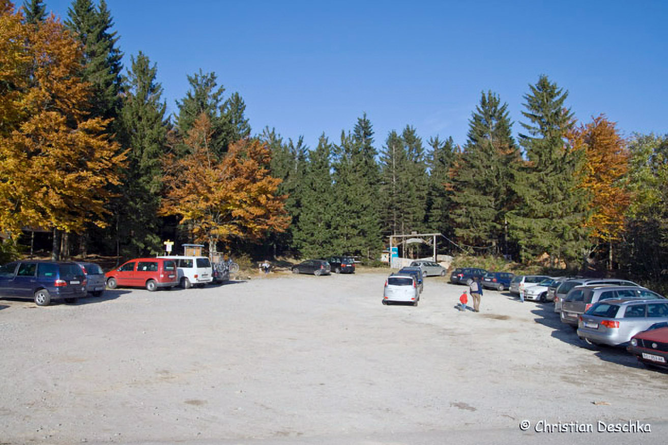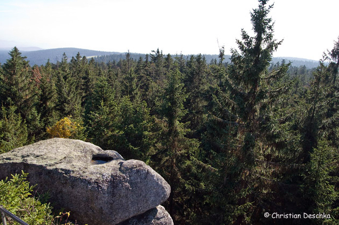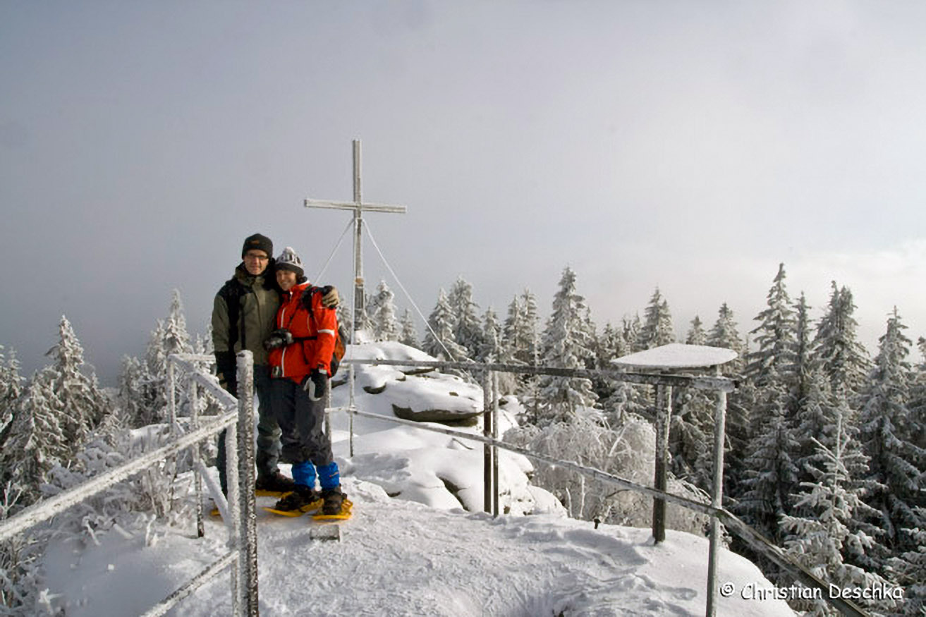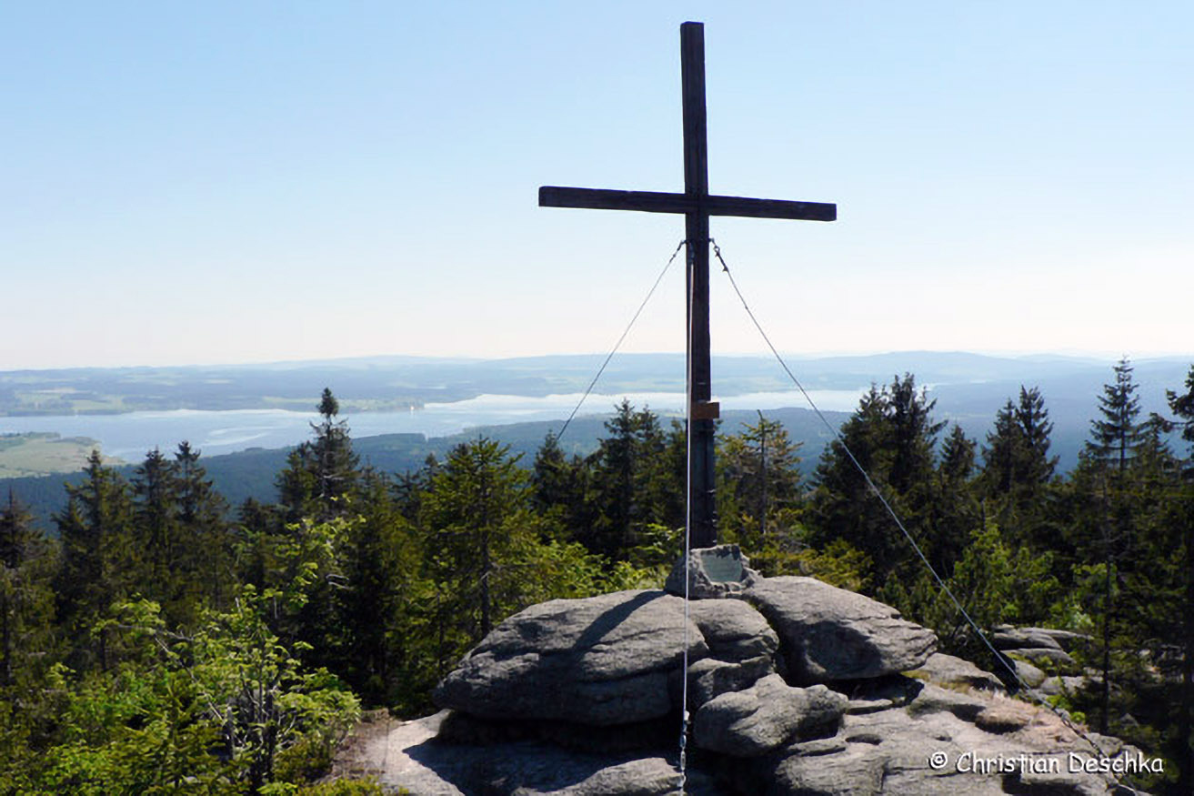 Am Gipfel stehen wir mitten im Böhmerwald, einem riesigen Waldgebiet, das sich insbesondere auch nach Tschechien (Sumava) und Bayern (Bayerischer Wald) erstreckt. Im Norden sehen wir den Moldaustausee in Tschechien.