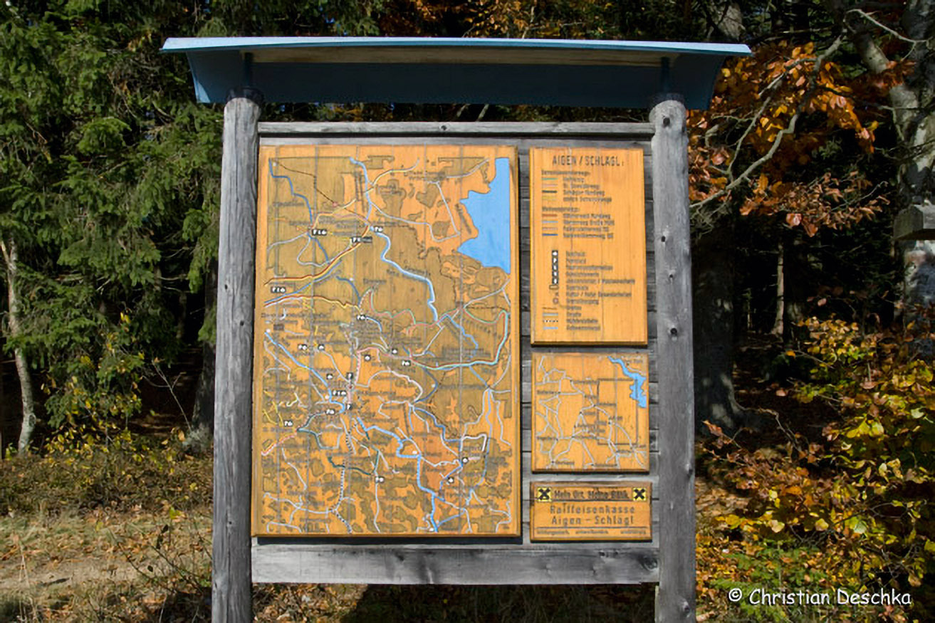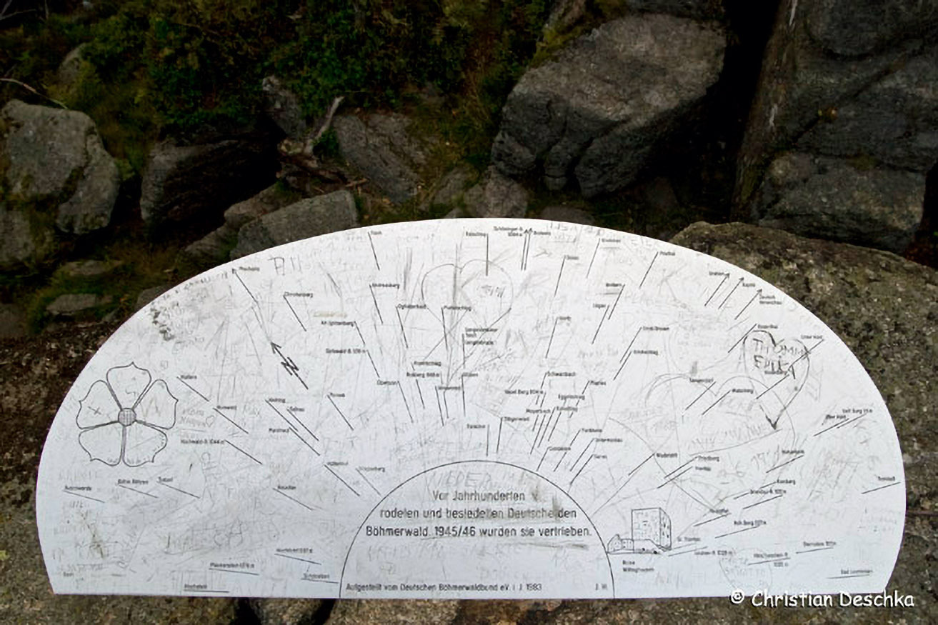 Eine Tafel am Geländer informiert über die Lage bestehender und verschwundener Ortschaften. Nach dem Zweiten Weltkrieg wurden nämlich aus dem hier einsehbaren Gebiet in Südböhmen viele deutschsprachige Menschen vertrieben.
