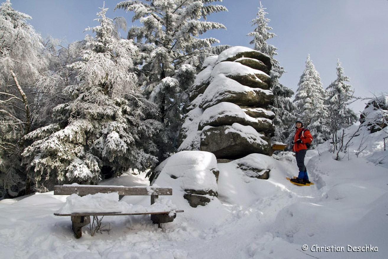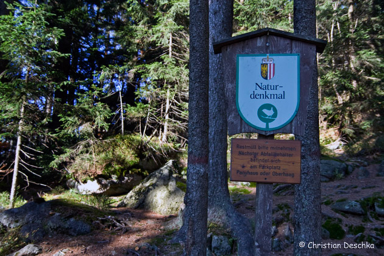 Nach etwa einer Stunde erreichen wir den Endpunkt dieser Wanderung - das Naturdenkmal Bärenstein. Naturdenkmäler schützen Besonderheiten wie diese Gesteinsformation. Eine Tafel am Fuße dieses Felsens mit "Wollsackverwitterung" erklärt dessen Entstehung: