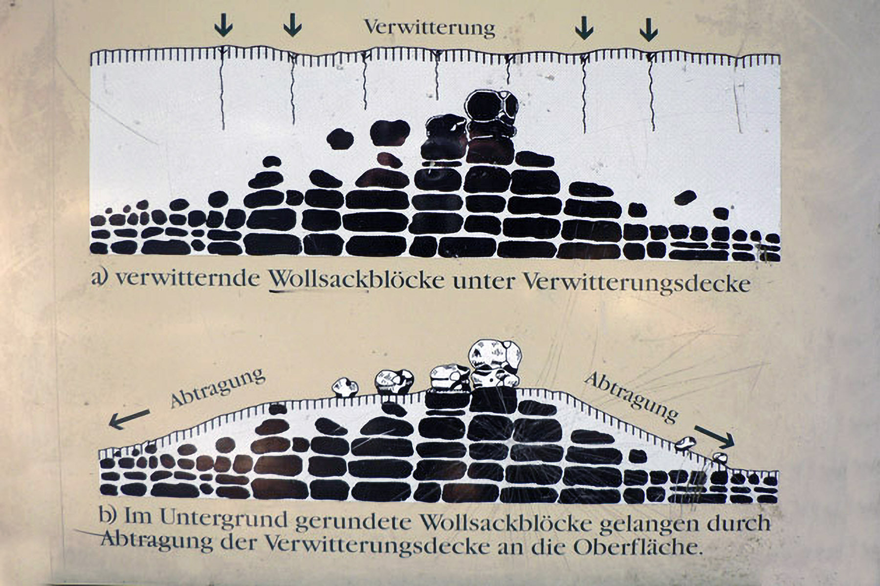 Die Verwitterung erfolgte bei tropischem Klima im Boden. Zunächst entstanden durch Risse im Fels eckige Blöcke. Deren Kanten wurden durch eindringendes Wasser aufgelöst und die Gesteinsblöcke damit gerundet. Schließlich wurden Teile der Felsformation freigelegt.