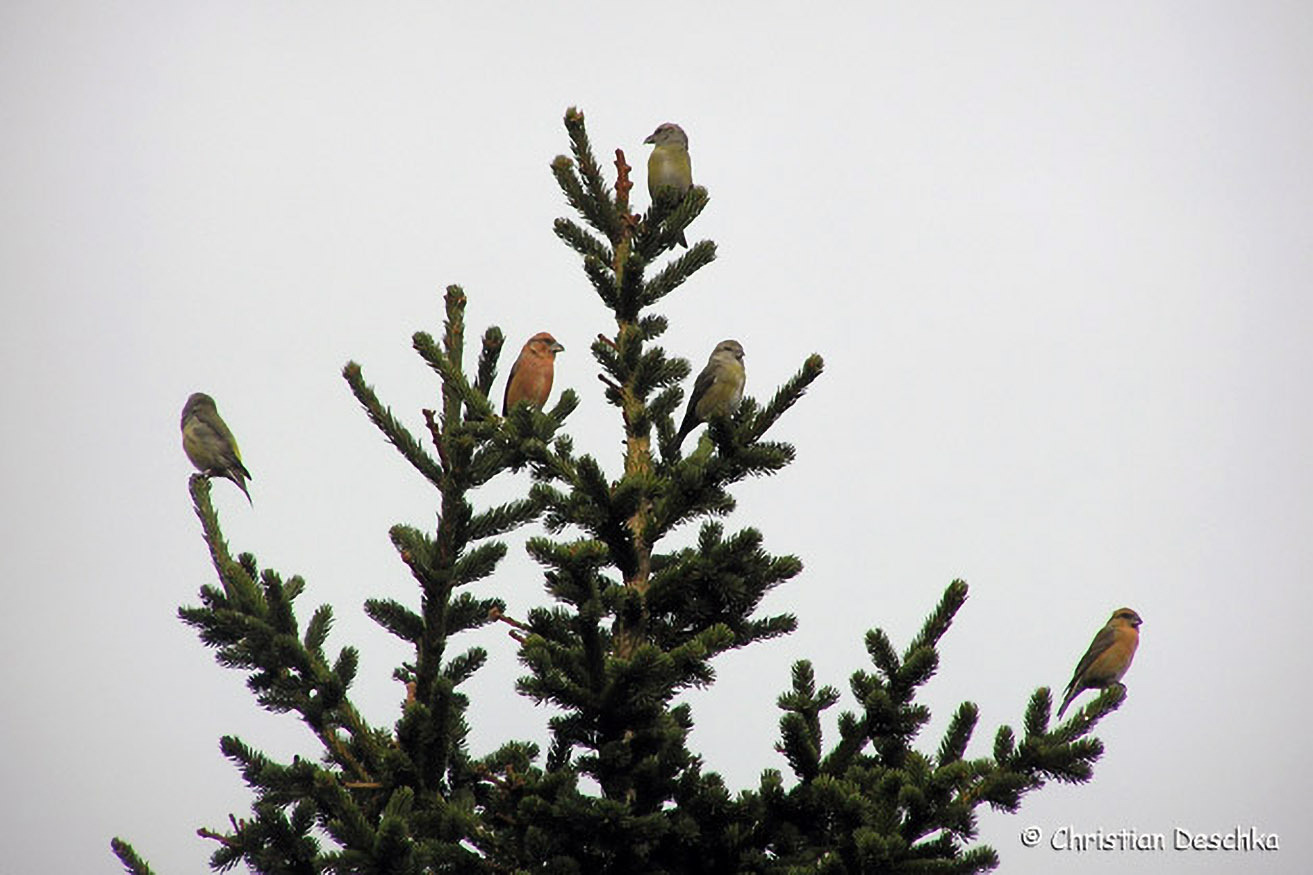 Insbesondere in einem "Zapfenjahr" wie heuer kann man auf den umliegenden Fichten Fichtenkreuzschnäbel beobachten. Diese an kleine Papageien erinnernden Vögel haben gekreuzte Schnäbel, mit denen sie die Samen aus den Zapfen holen können.