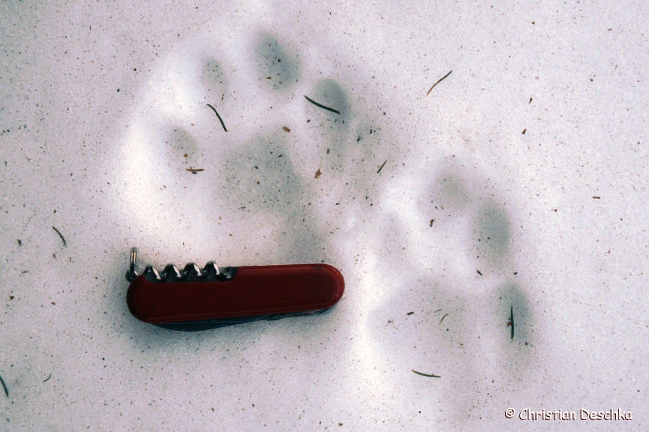 Seine Pfotenabdrücke sind faustgroß, sehen aber wie jene unserer Hauskatzen aus. Es sind keine Krallen abgedrückt. Die Ballen sind asymmetrisch angeordnet. Die Vorderpfote (li.) ist eher rund, die Hinterpfote (re.) eher länglich.