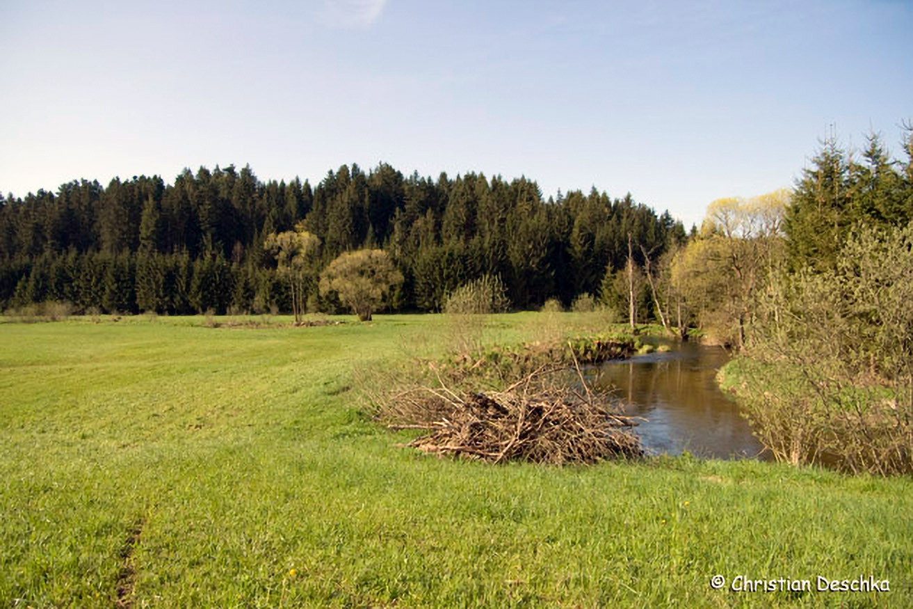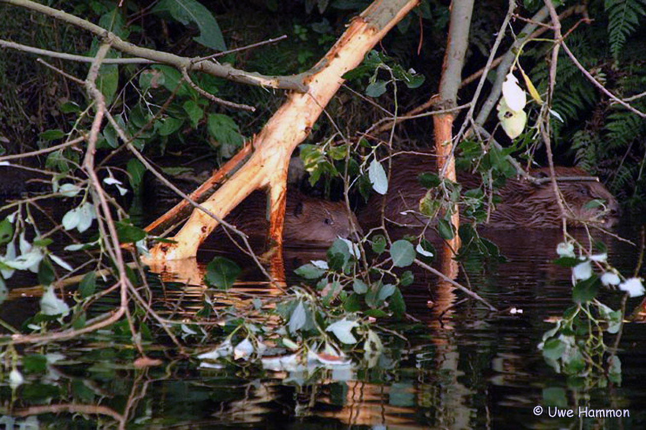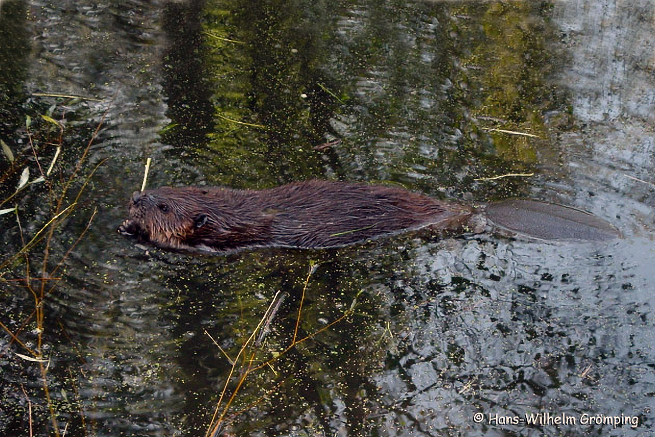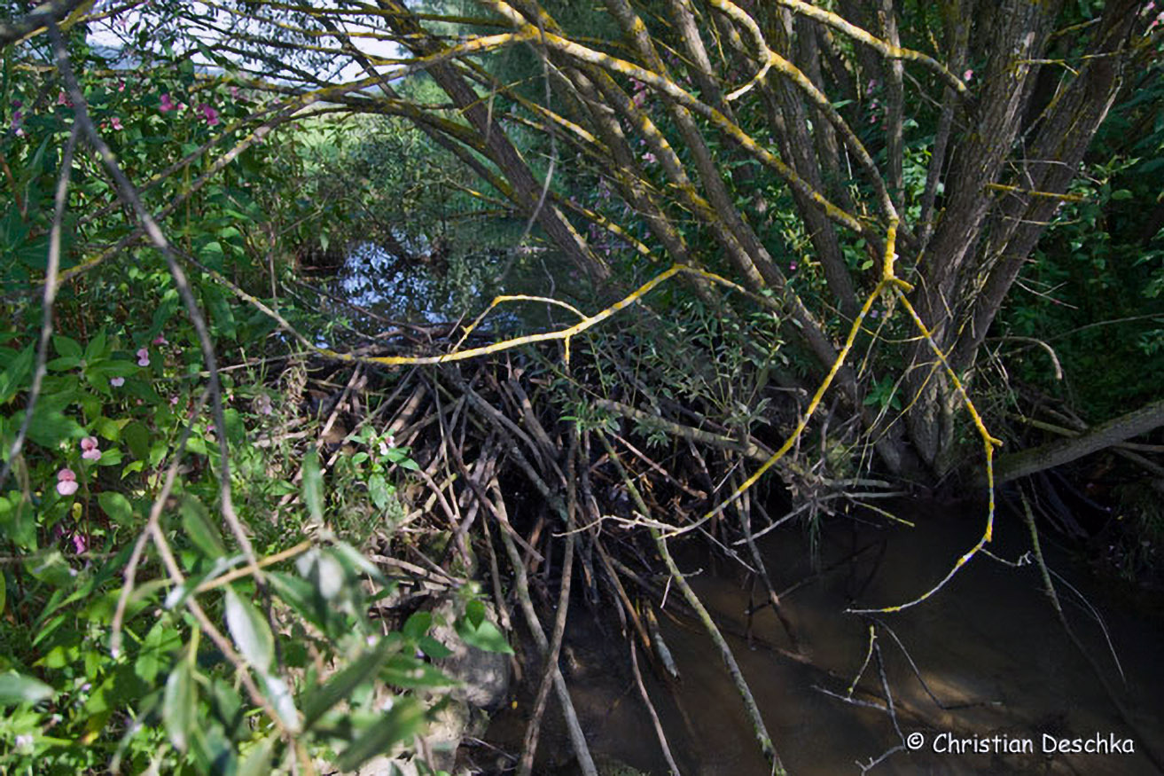 Kleinere Bäche staut der Biber auf, damit der Eingang zu seinem Bau unter Wasser liegt (Feindschutz!). Außerdem kann er dann schwimmend leichter Äste transportieren.