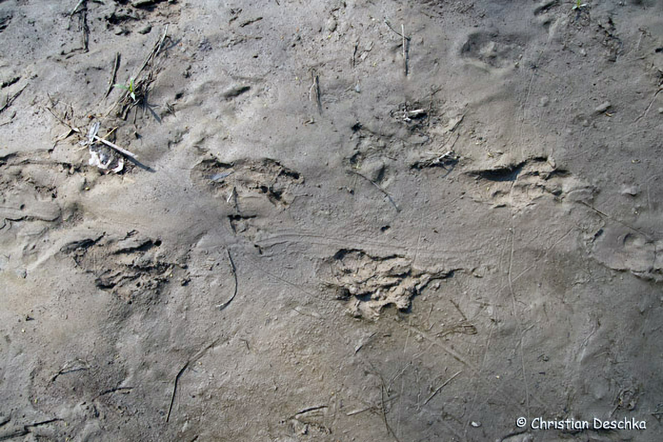 In weichem Schlamm werden die Zehen gespreizt. Dann sind bei den Abdrücken der Hinterpfoten auch die Schwimmhäute zu erkennen. Hinterfußabdrücke entsprechen hinsichtlich ihrer Größe jenen von Kinderfüßen.