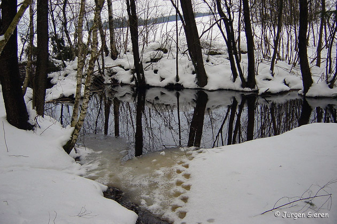 Im Uferschlamm findet man auch gelegentlich die Fußspuren der Biber. Die bis 5 cm großen Vorderpfoten sind rundlich, die bis zu 18 cm langen Hinterpfoten länglich. Beide weisen 5 Zehen auf, von denen sich aber manchmal nur 4 abdrucken.