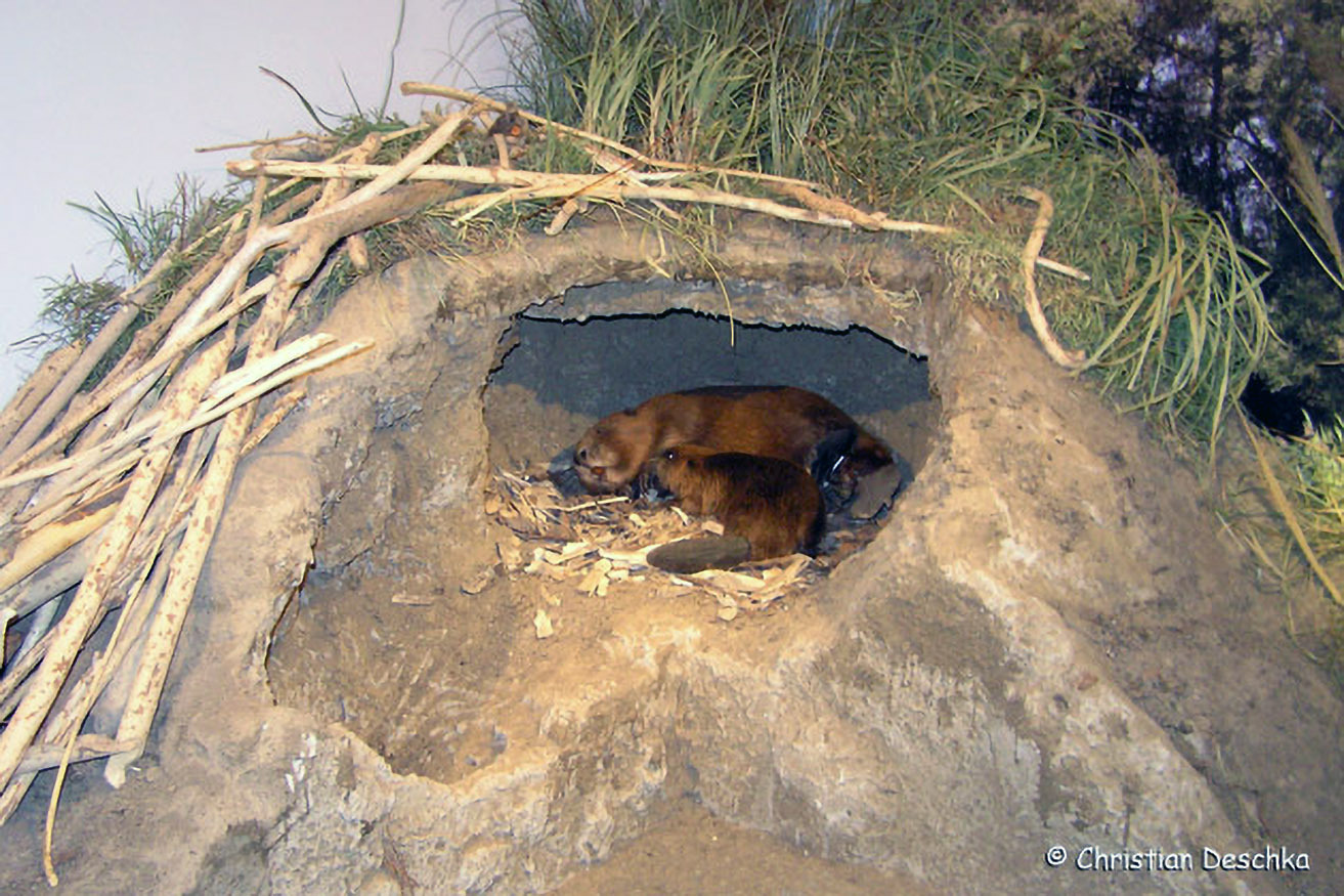 Hier sieht man ein Modell, das den Querschnitt durch einen Erdbau zeigt. Man kann die beiden auf Spänen ruhenden Biber, den Ein- und Ausgang und die angenagten Äste außerhalb gut erkennen.