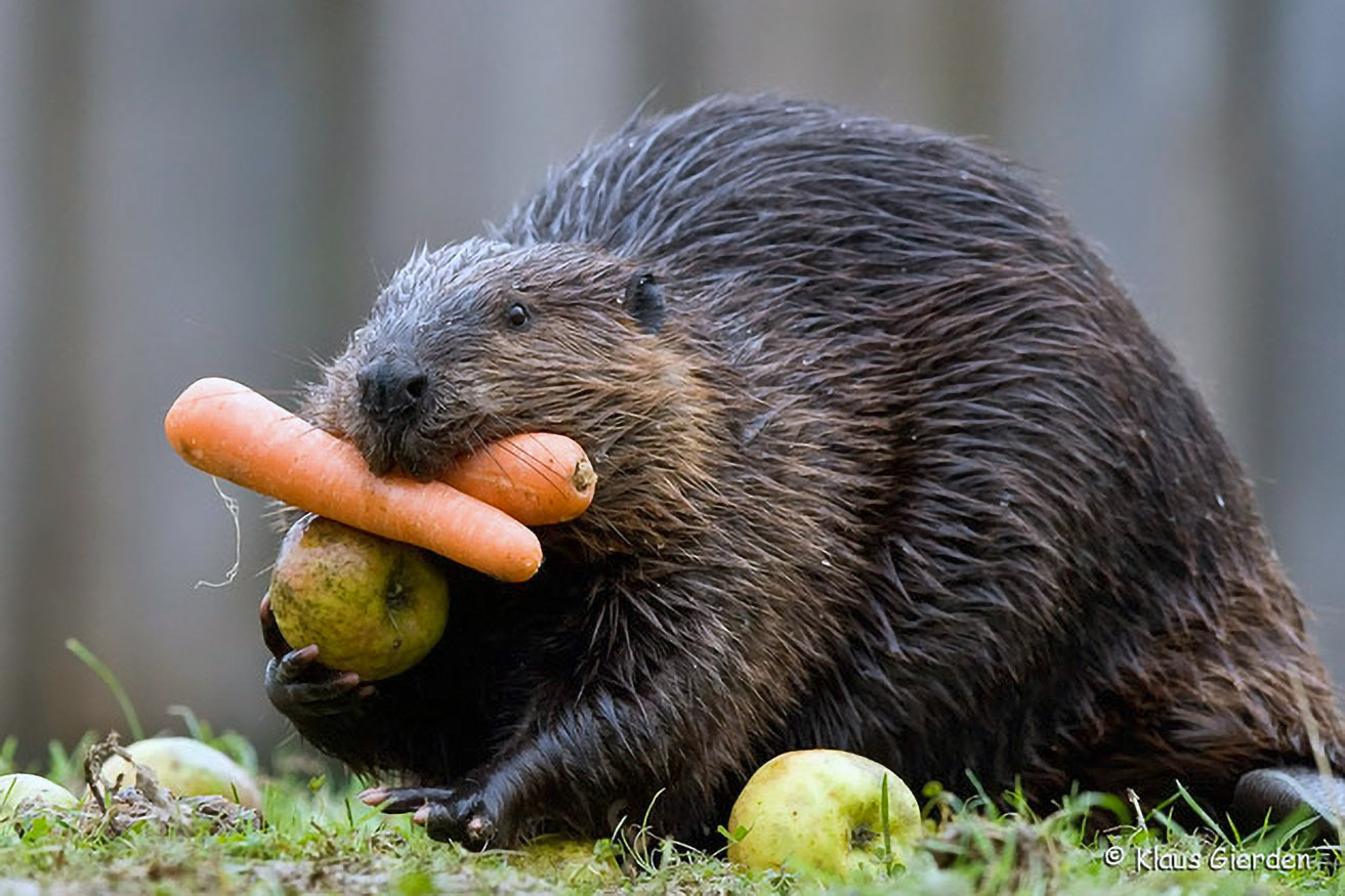 Im Sommer machen Gräser, Kräuter, Wasserpflanzen, Knollen (z.B. Rüben), Früchte etc. einen beträchtlichen Teil der Nahrung aus. Biber suchen auch regelmäßig Futterstellen für Enten auf. Dieser Zoobiber wird mit Karotten und Äpfeln gefüttert.