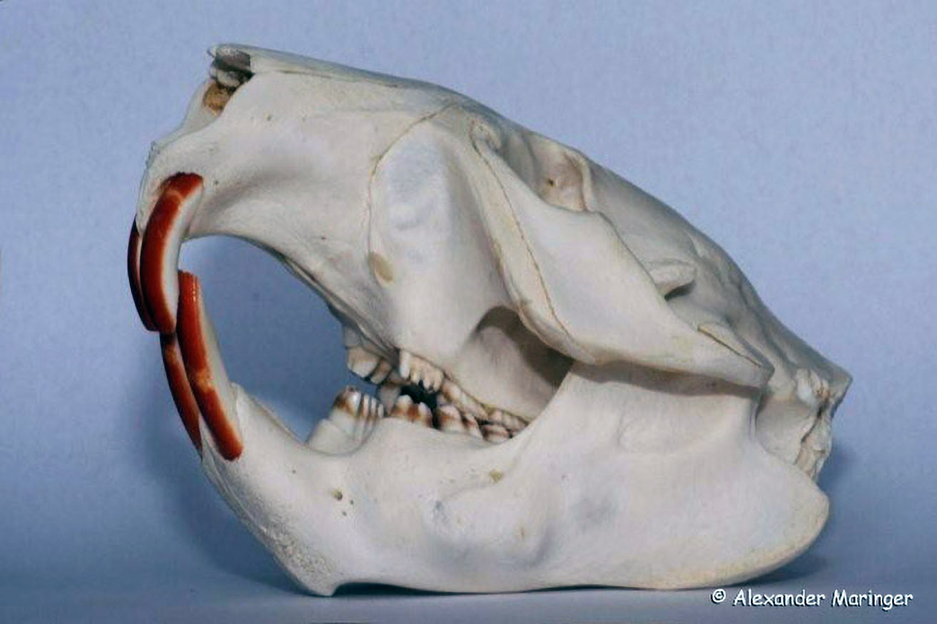 Beim Benagen der Bäume kommen die langen, ständig nachwachsenden Schneidezähne (Nagezähne) zum Einsatz. Jene des Oberkiefers haken im Baum ein und bilden ein Widerlager. Die des Unterkiefers schneiden Späne heraus.
