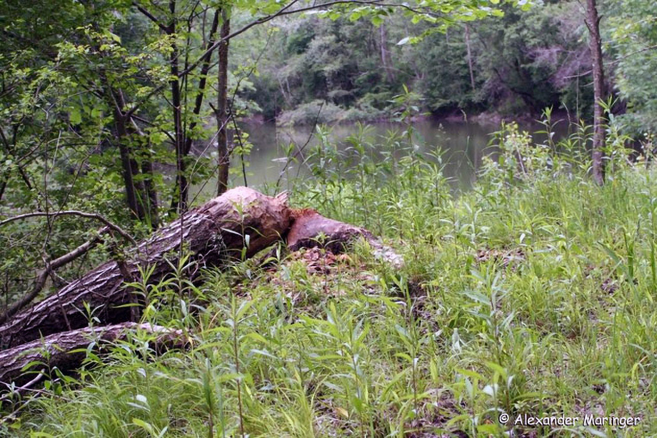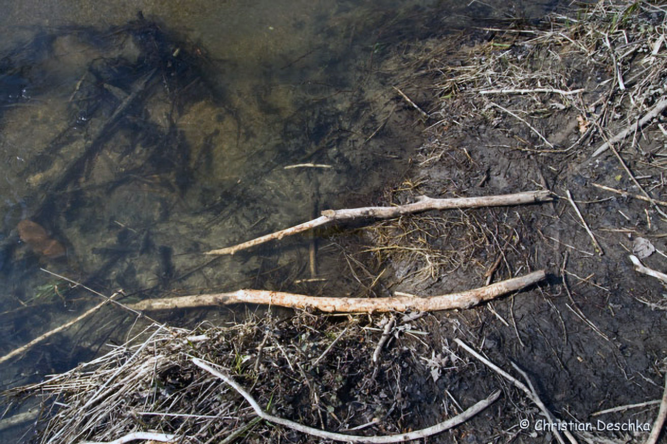 Zurück bleiben abgenagte Äste am Ufer. Bevorzugt werden übrigens Weichhölzer wie Weiden und Pappeln. Es werden aber durchaus auch andere Baumarten nicht verschmäht.