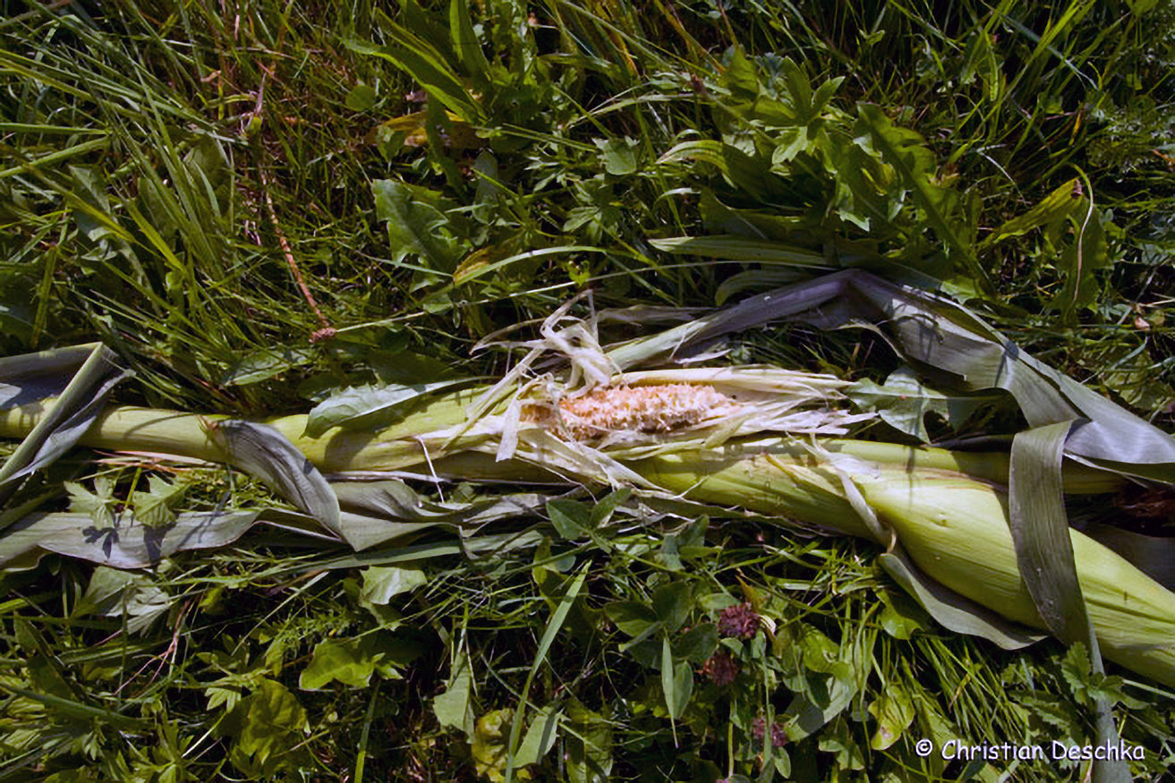 Maispflanzen werden vor Ort verzehrt oder "gefällt" und bis in den nächsten Bach geschleppt. Hier sieht man einen angefressenen, unreifen Maiskolben.