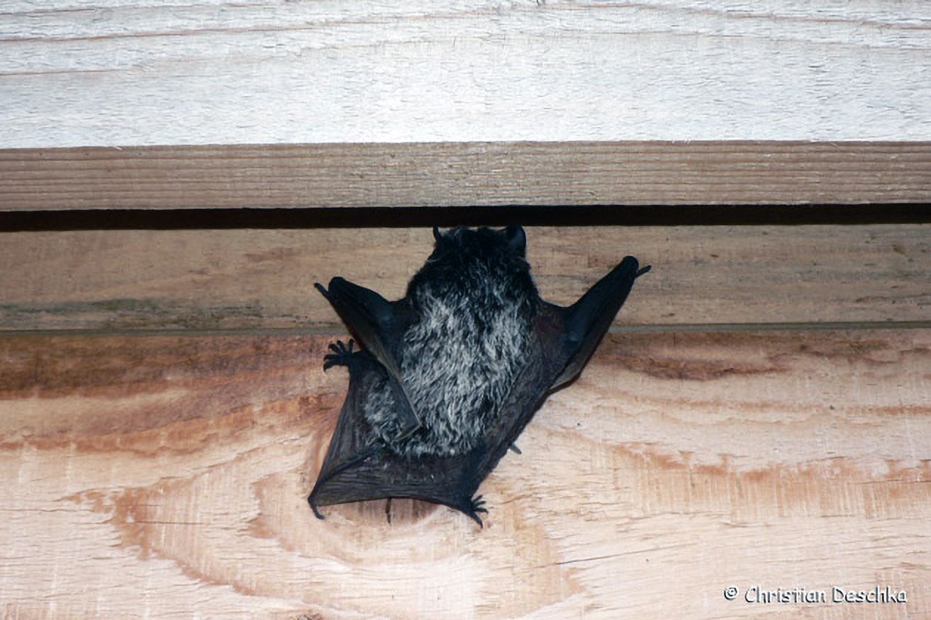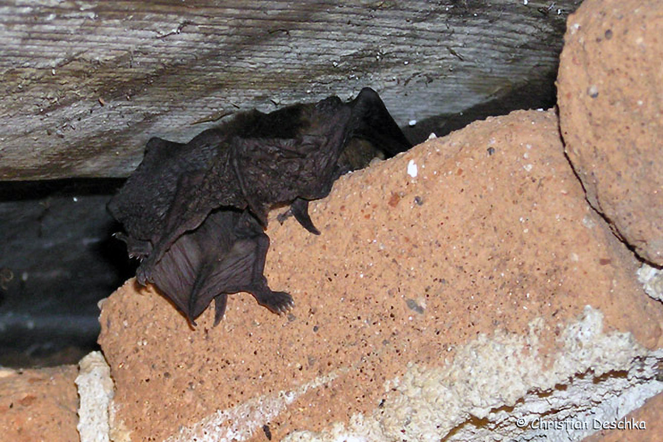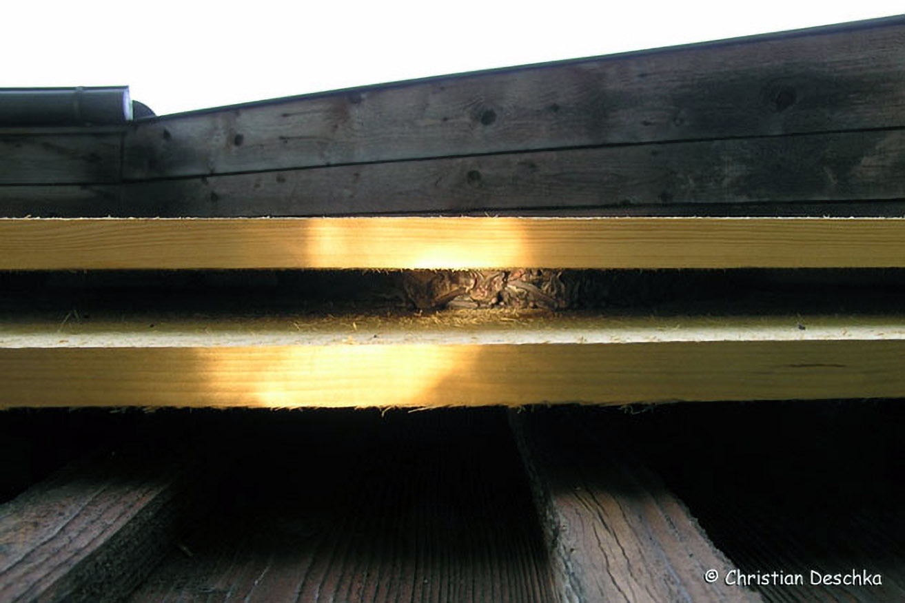 Die Mopsfledermaus hat aber auch gelernt, Verstecke an menschlichen Gebäuden zu nutzen. Wo sie dies regelmäßig tut, sind manchmal weißliche Spuren zu finden.