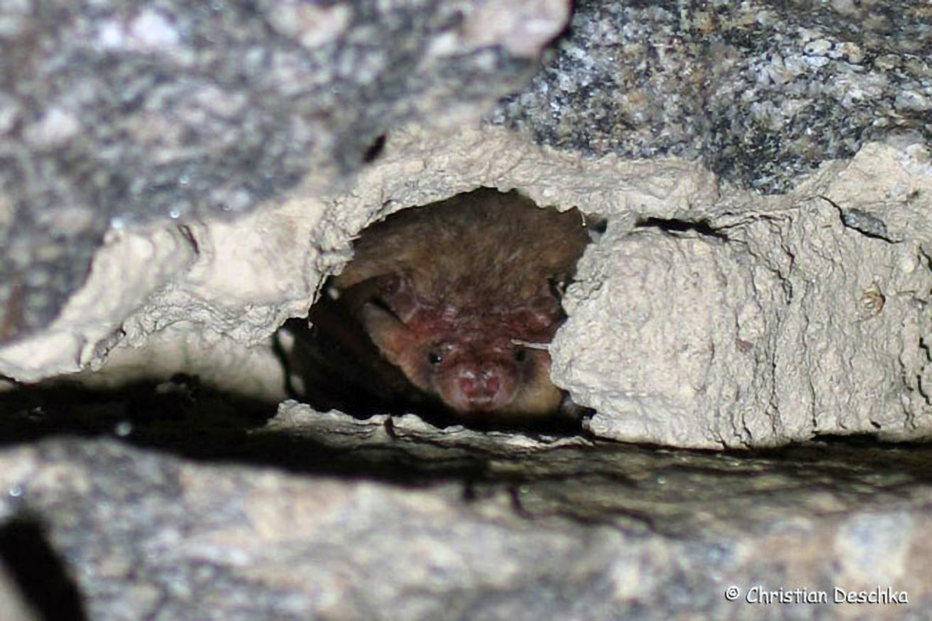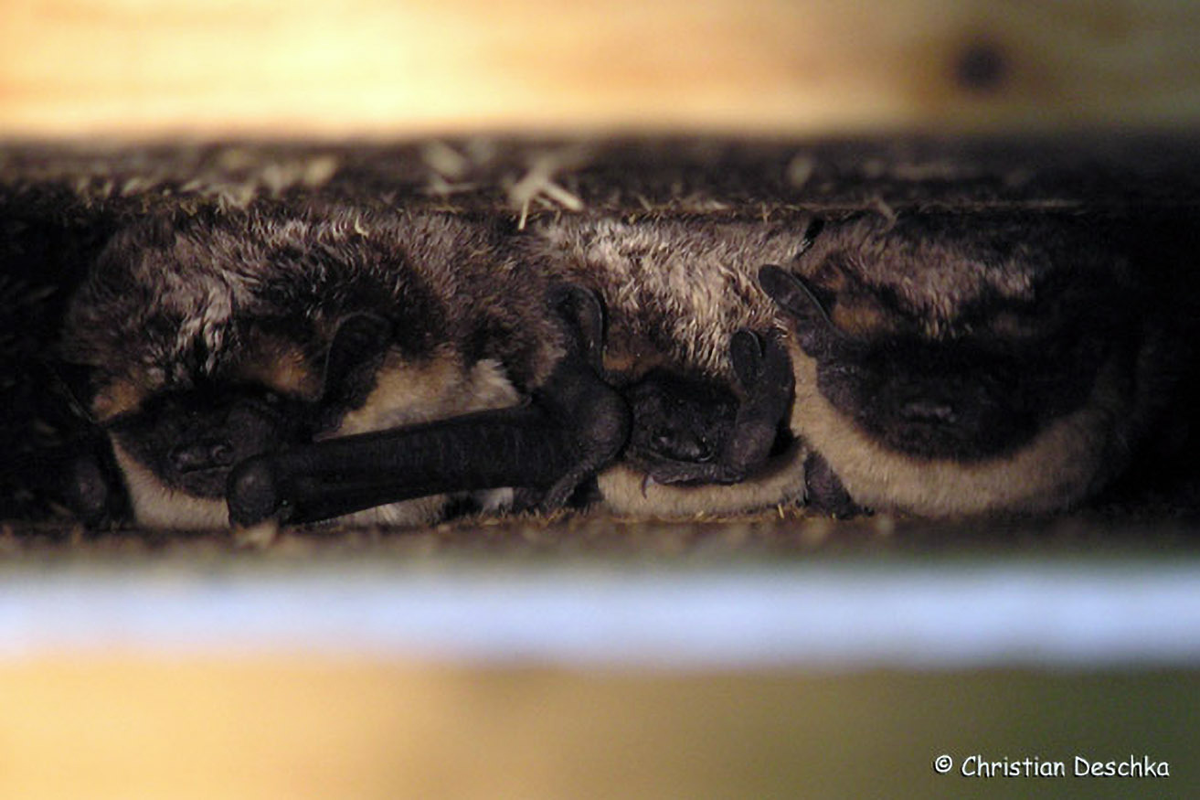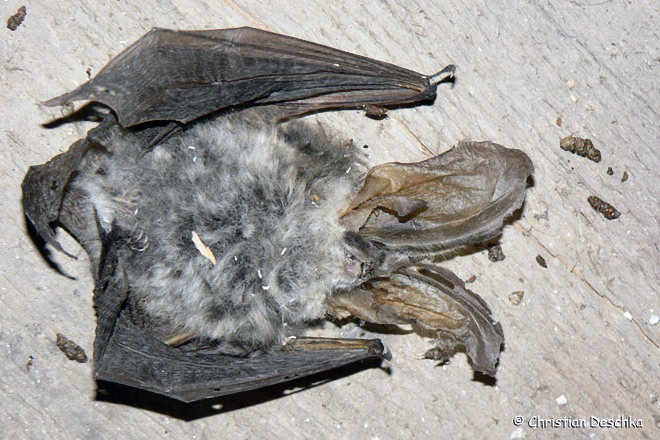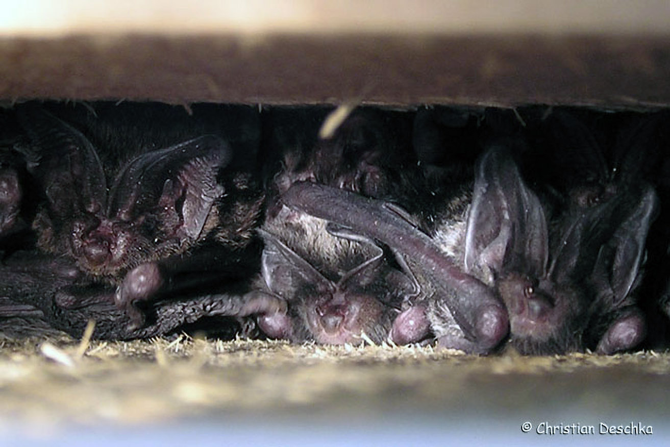Die Mopsfledermaus hat aber auch gelernt, Verstecke an menschlichen Gebäuden zu nutzen. Wo sie dies regelmäßig tut, sind manchmal weißliche Spuren zu finden.