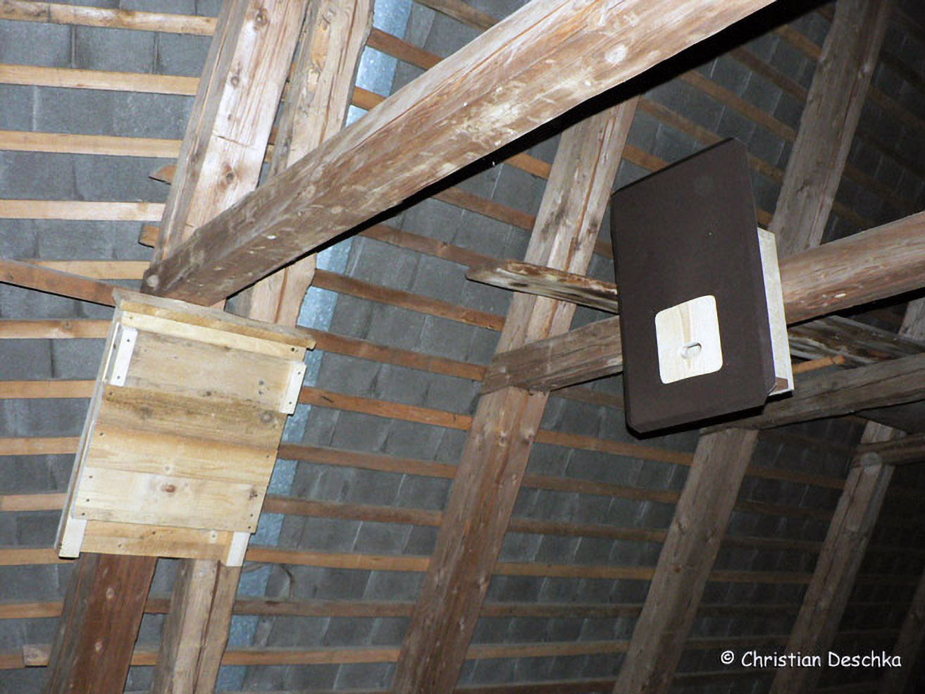 Auf einigen Kirchendachböden haben wir Fledermauskästen aufgehängt. Diese stellen zusätzliche, für uns leicht kontrollierbare Fledermausverstecke dar. Durch regelmäßige Kontrolle erhalten wir einen Überblick über vorkommende Arten.