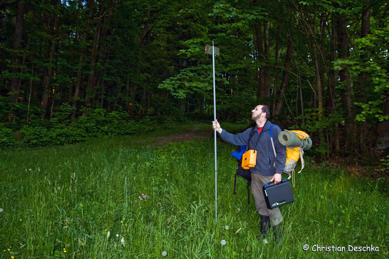 Hier stellt der Biologe Guido Reiter (KFFÖ) einen Ultraschalldetektor auf, der vorbeifliegende Fledermäuse automatisch aufzeichnet. Die Auswertung und bestimmung der Arten erfolgte später am Computer.