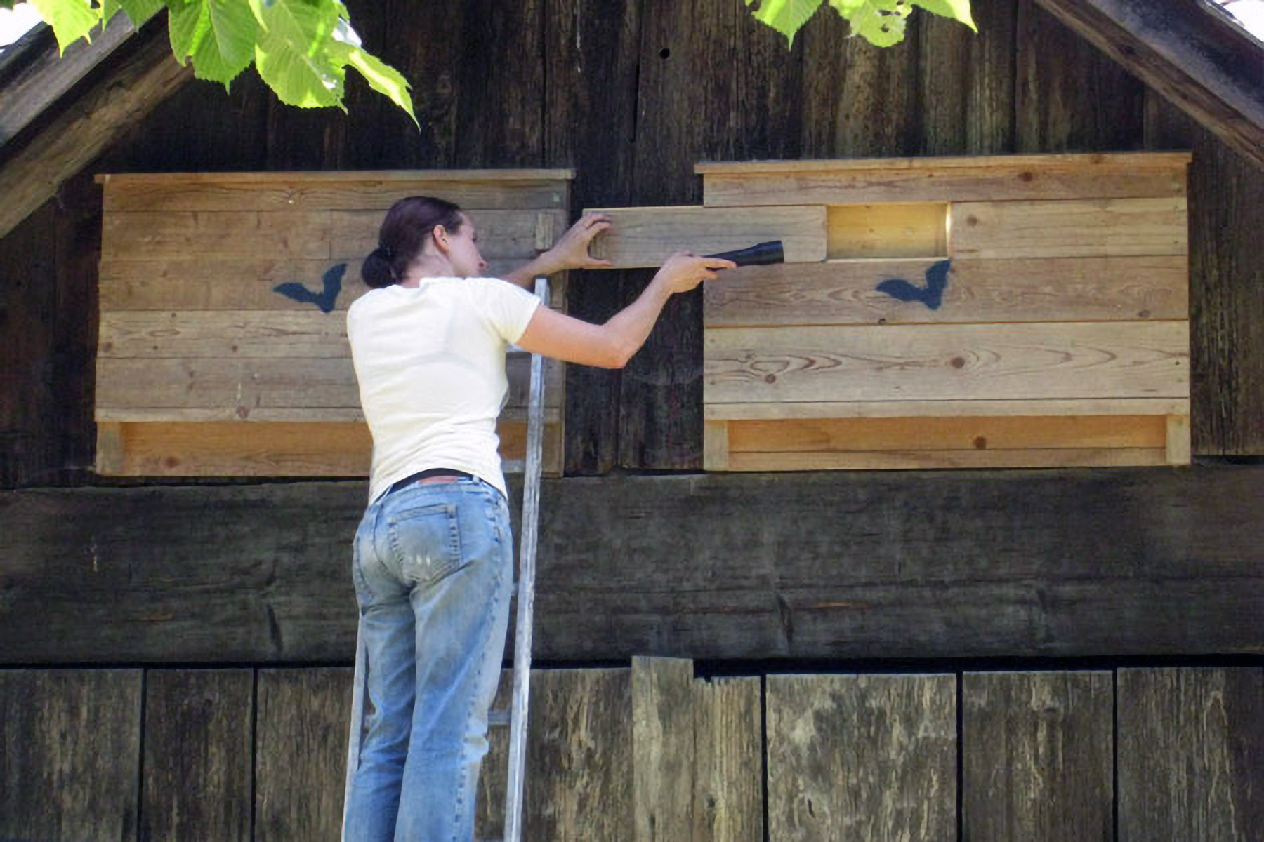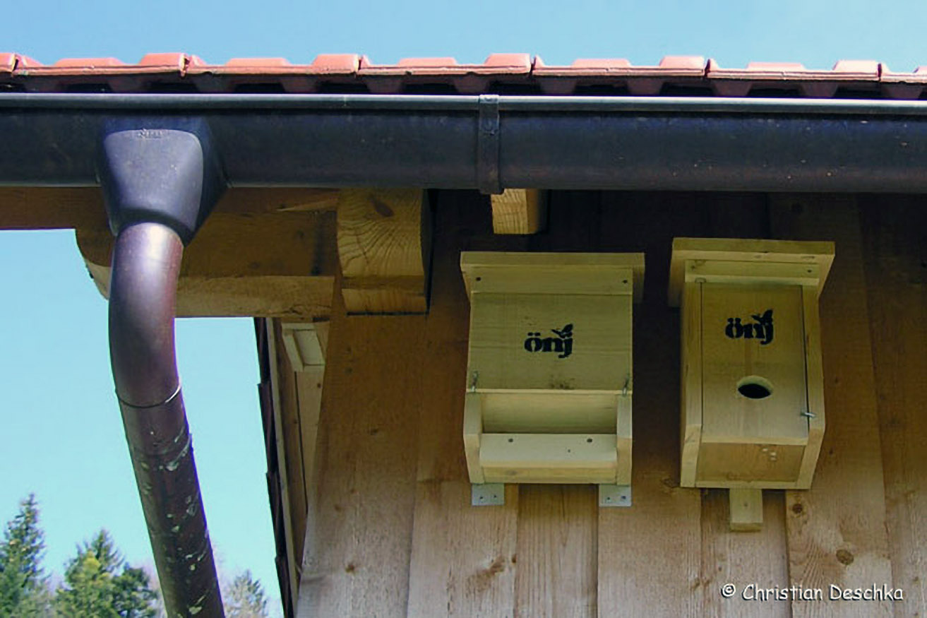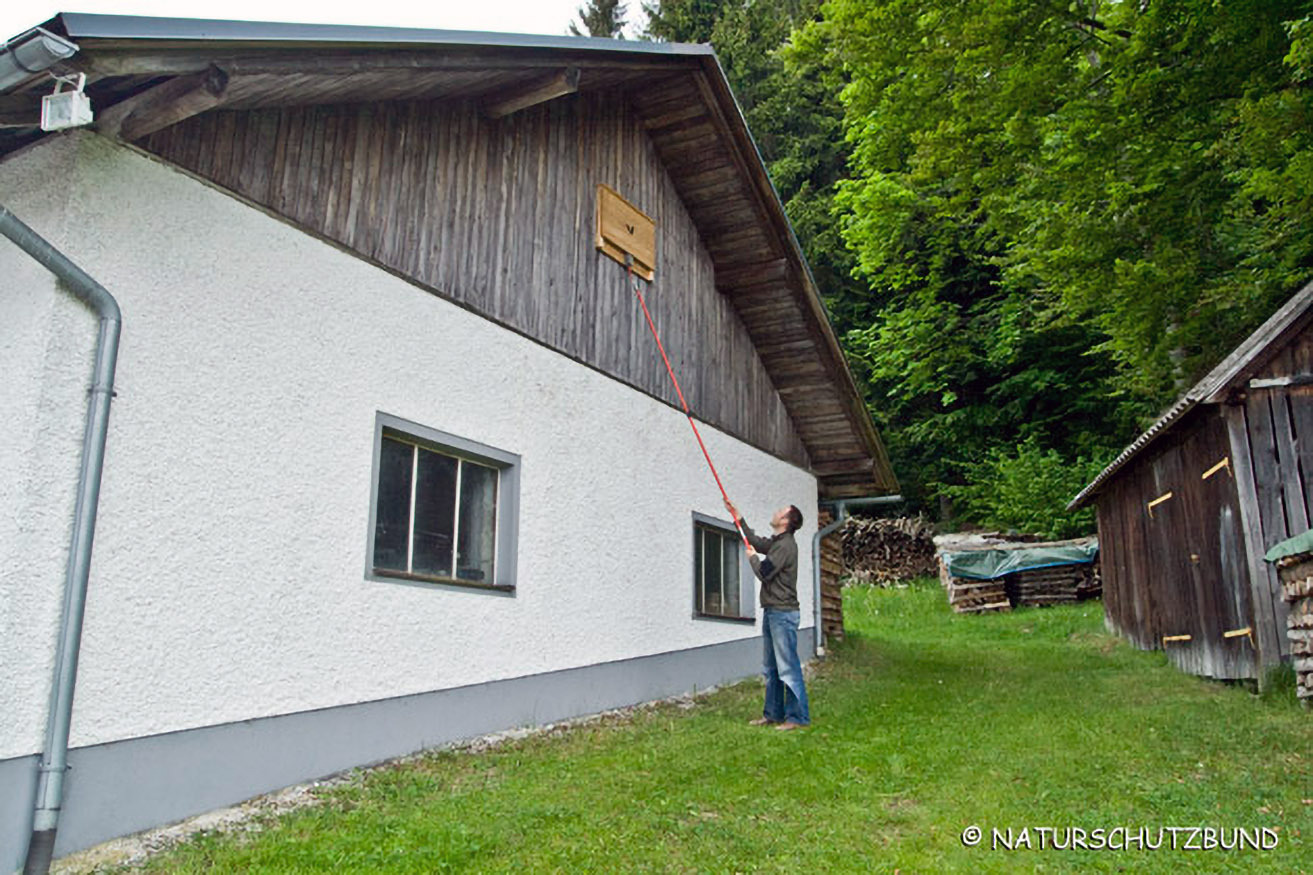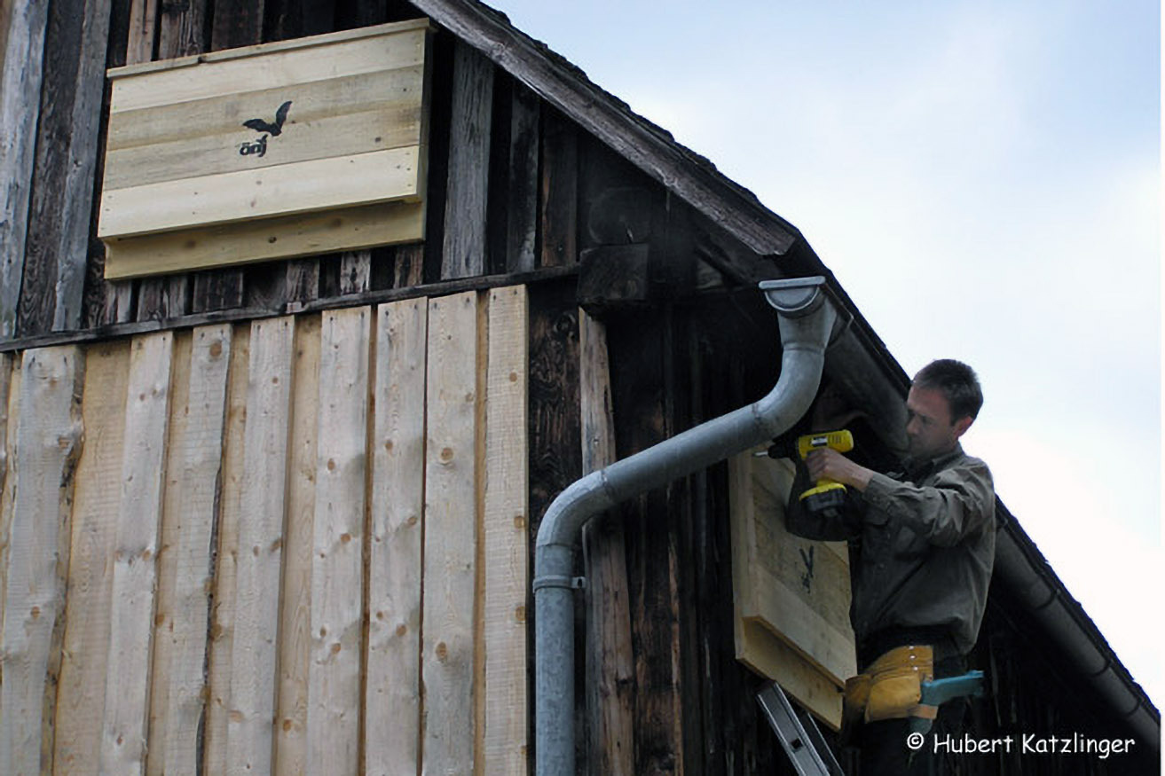 Die Montage ist auf Holzwänden am einfachsten. Idealerweise werden die Kästen in 3-4 m Höhe unter dem Dachvorsprung (Witterungsschutz) oben auf die Leiter gestellt und angeschraubt. Ein Zimmermannsgurt erleichtert die Arbeit.
