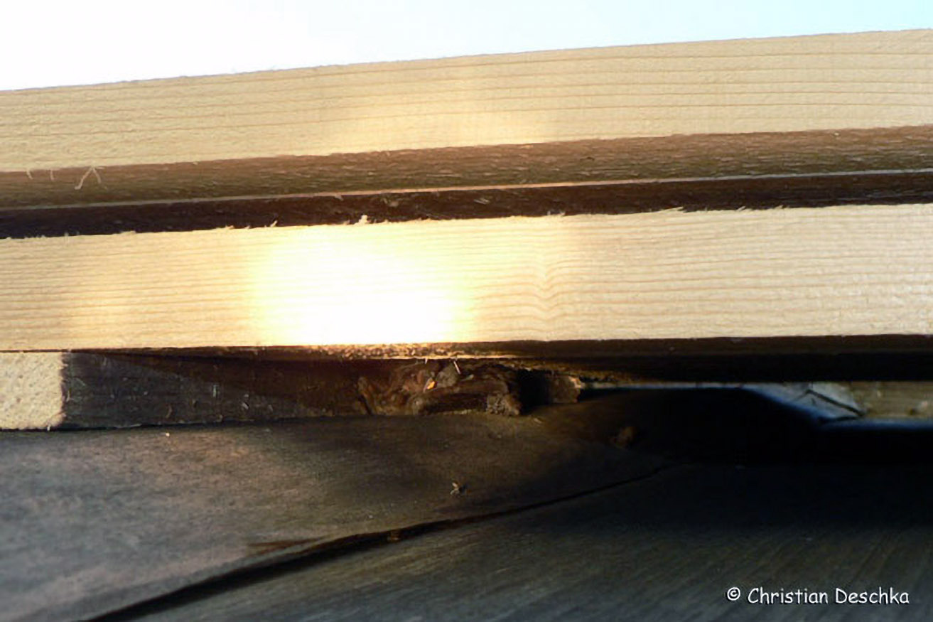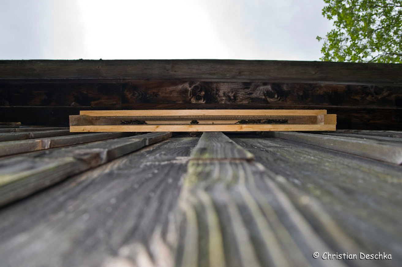 Spalten hinter dem Kasten werden ebenfalls gerne angenommen, insbesondere von Einzeltieren. In diesem Fall wurde der Kasten auf einen Keil geschraubt, um ihn vom Boden aus besser einsehbar zu machen.