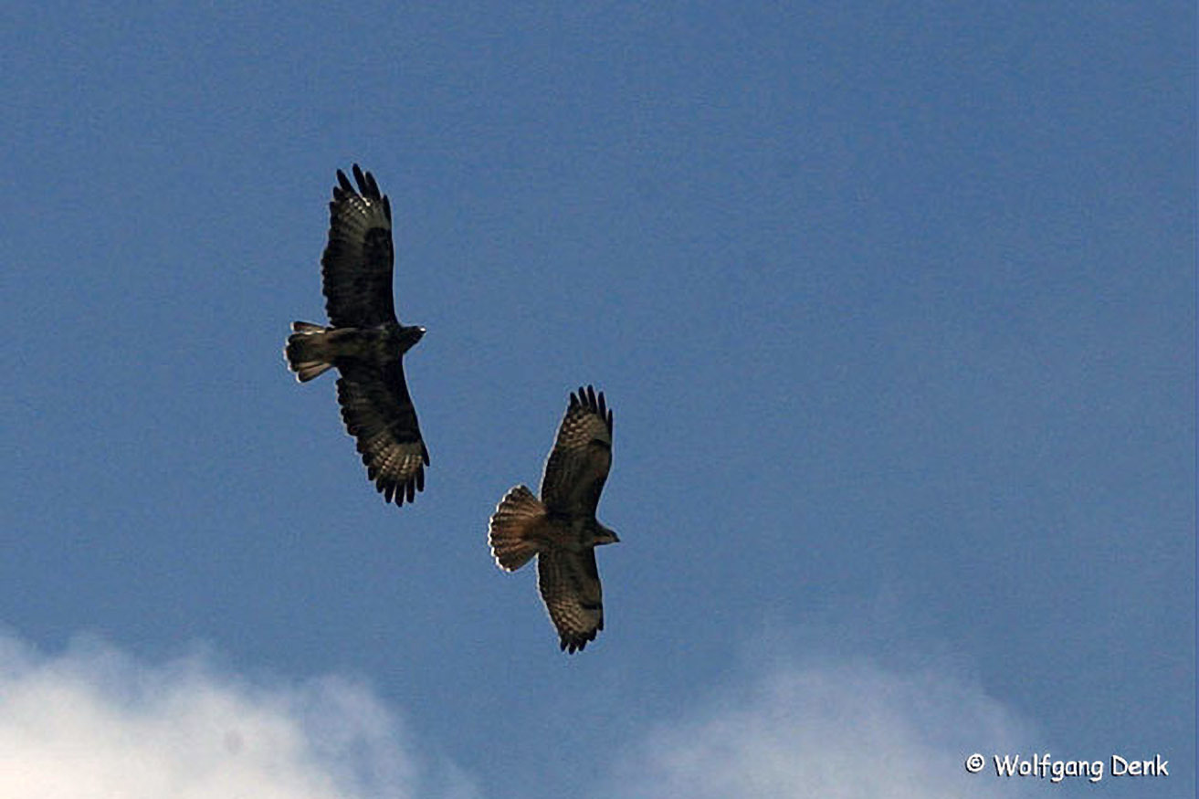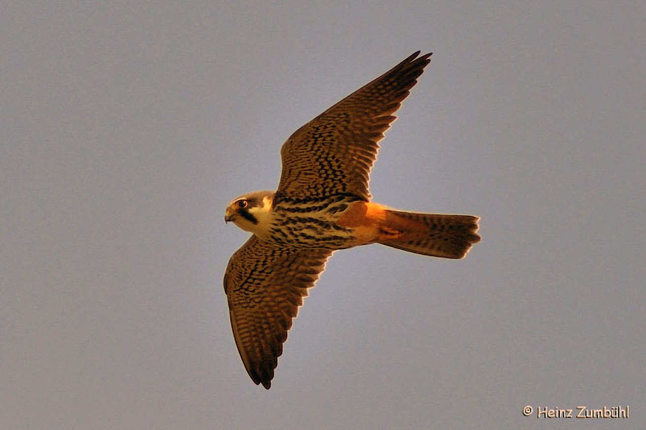 Neben den bei uns brütenden Greifvögeln kann man vor allem im Frühling und Herbst auch durchziehende Arten beobachten. Der hier abgebildete Rotfußfalke schließt sich gelegentlich Baumfalkentrupps an.