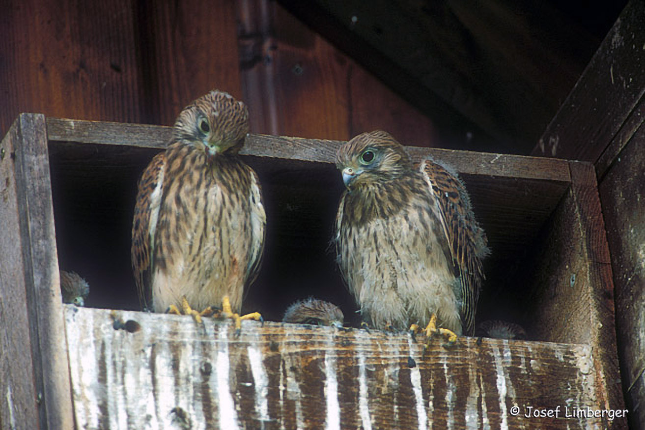 Turmfalken nehmen auch Nistkästen an Gebäuden gerne an. Hier sehen wir fast flügge Jungvögel.