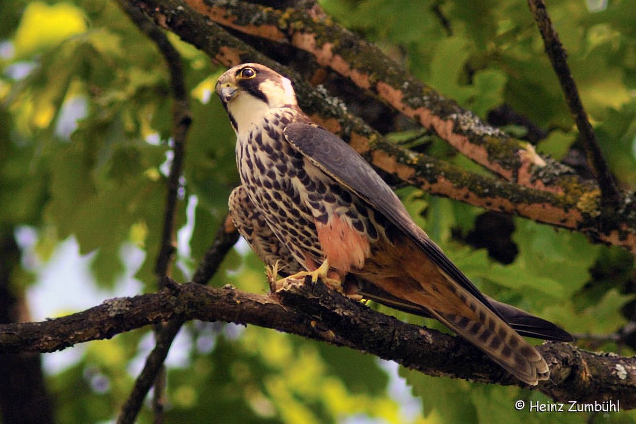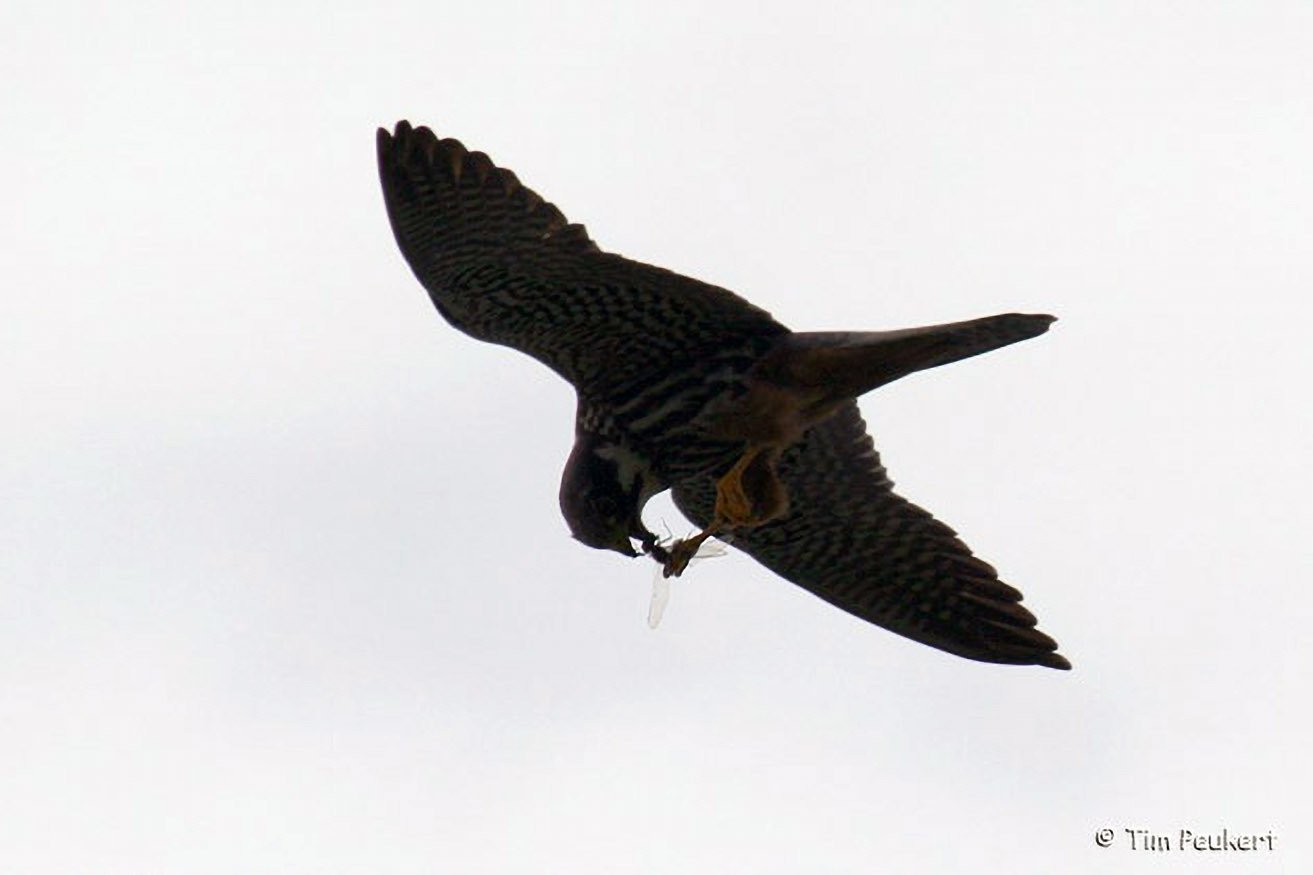 Der Baumfalke ist ein schnittiger Jäger, der mit hoher Geschwindigkeit im freien Luftraum jagt. Er kann sogar Schwalben erbeuten. Durch deren Warnrufe wird man oft erst auf den Falken aufmerksam.