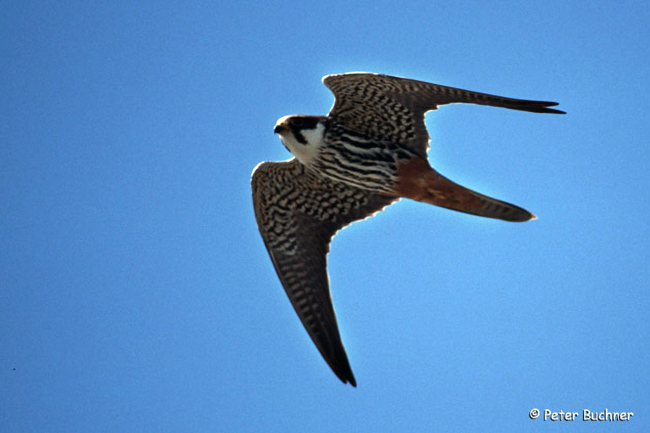 Lange, schmale und sichelförmige Schwingen und ein relativ kurzer Stoß sind die Kennzeichen des Baumfalken. Bei guten Lichtverhältnissen sieht man auch den Backenstreif, die dunklen Flecken am Bauch und den orangen "Hintern".