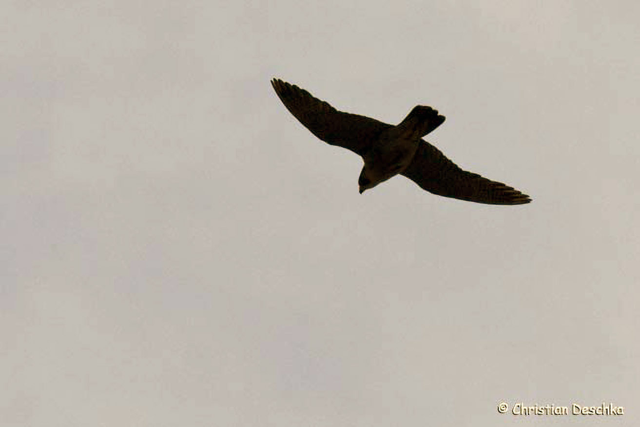 Auf der Jagd schraubt sich der Wanderfalke in die Höhe, hält nach fliegenden Vögeln Ausschau und versucht diese im Sturzflug zu erbeuten. Dieser relativ große, kräftige und kompakte Falke ist für geübte Beobachter auch an seinen Umrissen erkennbar.