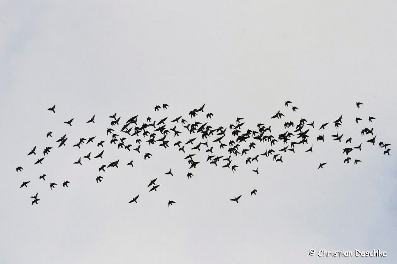 Mögliche Beutetiere wie Ringeltauben bilden bei seinem Auftauchen dichte Schwärme. Dadurch fällt es dem Falken schwerer, sich bei der Jagd auf ein Einzeltier zu konzentrieren und zu erbeuten.