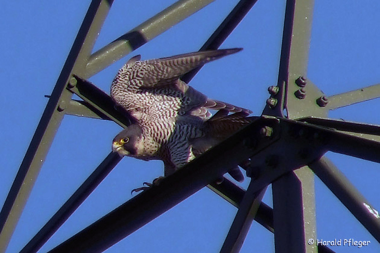 Manchmal jagt der Wanderfalke auch von hohen Warten aus. In der Agrarlandschaft können Strommasten als solche dienen.
