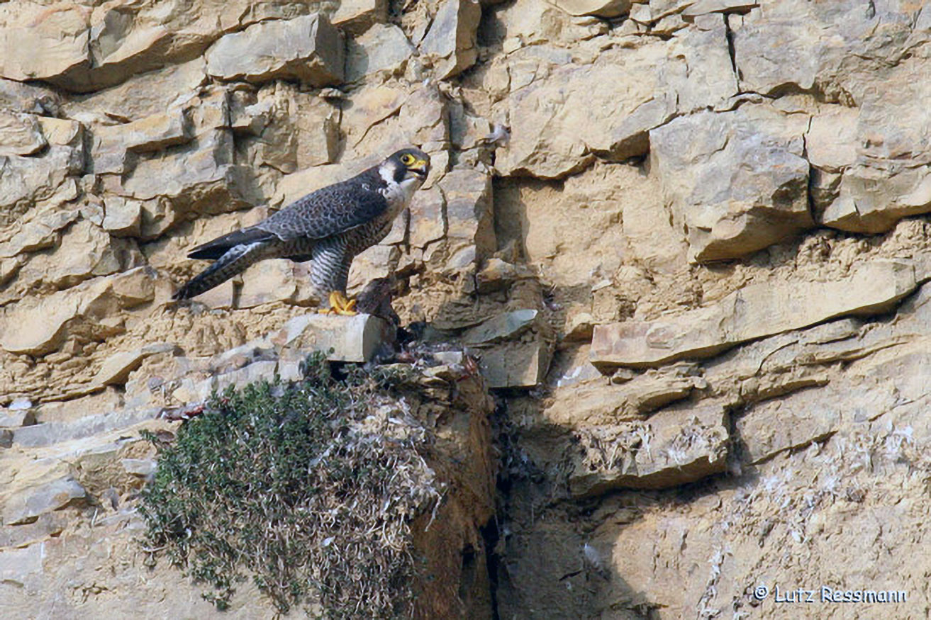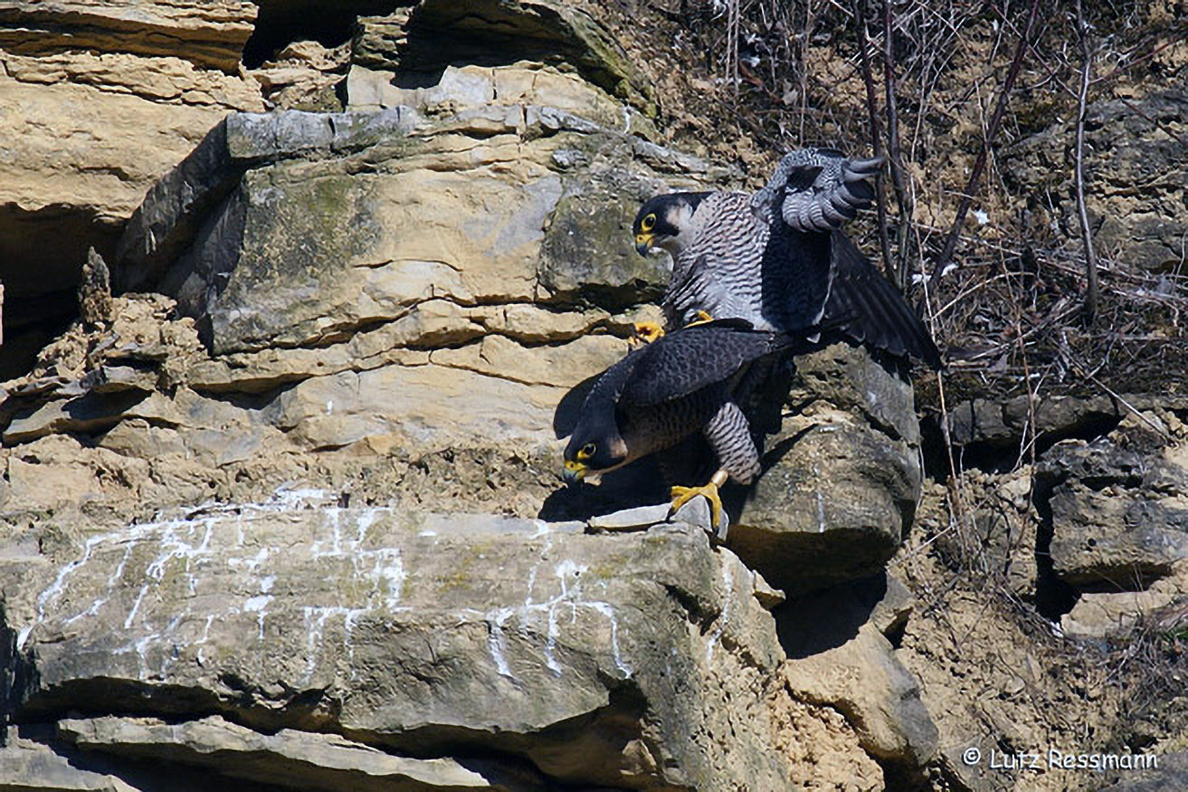 Wanderfalken sind ganzjährig im Bereich ihres Brutplatzes an Felswänden zu beobachten. Die Balz findet bereits im Februar statt. Dann können spektakuläre Balzflüge, Beuteübergaben und Kopulationen beobachtet werden.