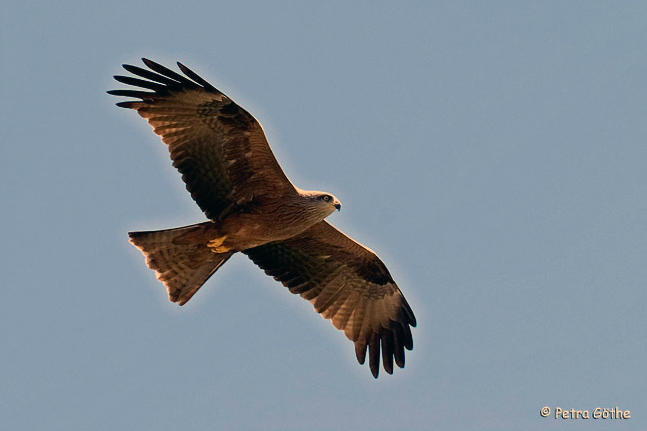 Der Rotmilan hat insbesondere am stark gegabelten Stoß rote Federn. Der Kopf ist grau gefärbt. Dass er ein begnadeter Segler ist, kann man auch an gelegentlich durchziehenden Tieren beobachten.