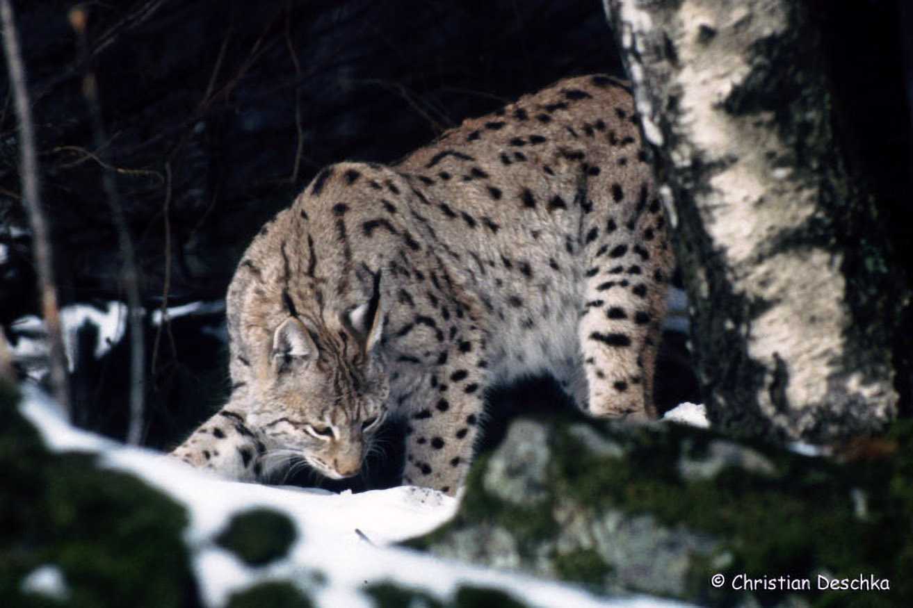 Luchse sind hervorragende Kletterer. In Wildnisgebieten führen ihre Spuren oft über liegende Baumstämme.
