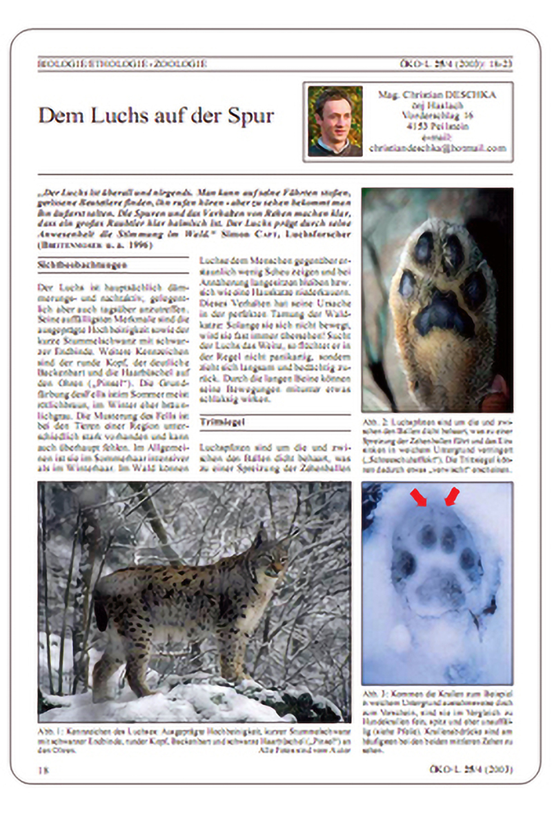 Diese Broschüre informiert darüber hinaus über das Erkennen und Dokumentieren von Spuren, Losungen und Beutetieren von Luchs, Wolf, Braunbär, ... Näheres findest du unter Literatur.