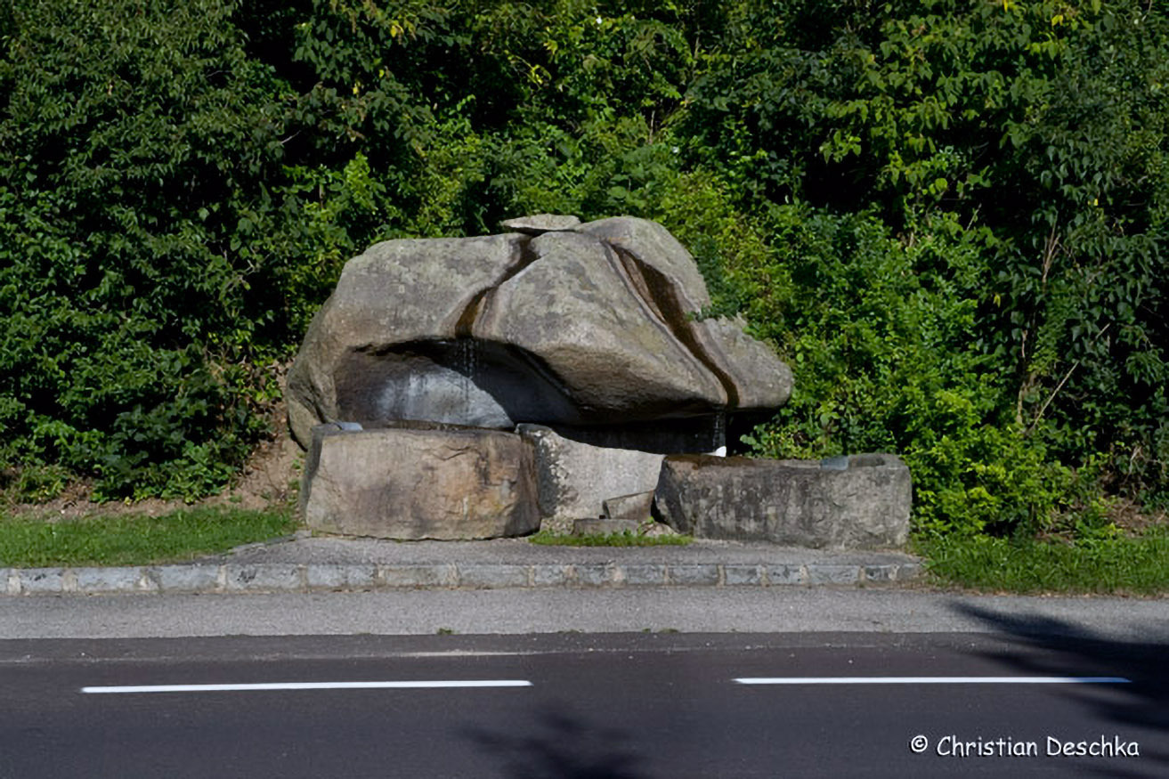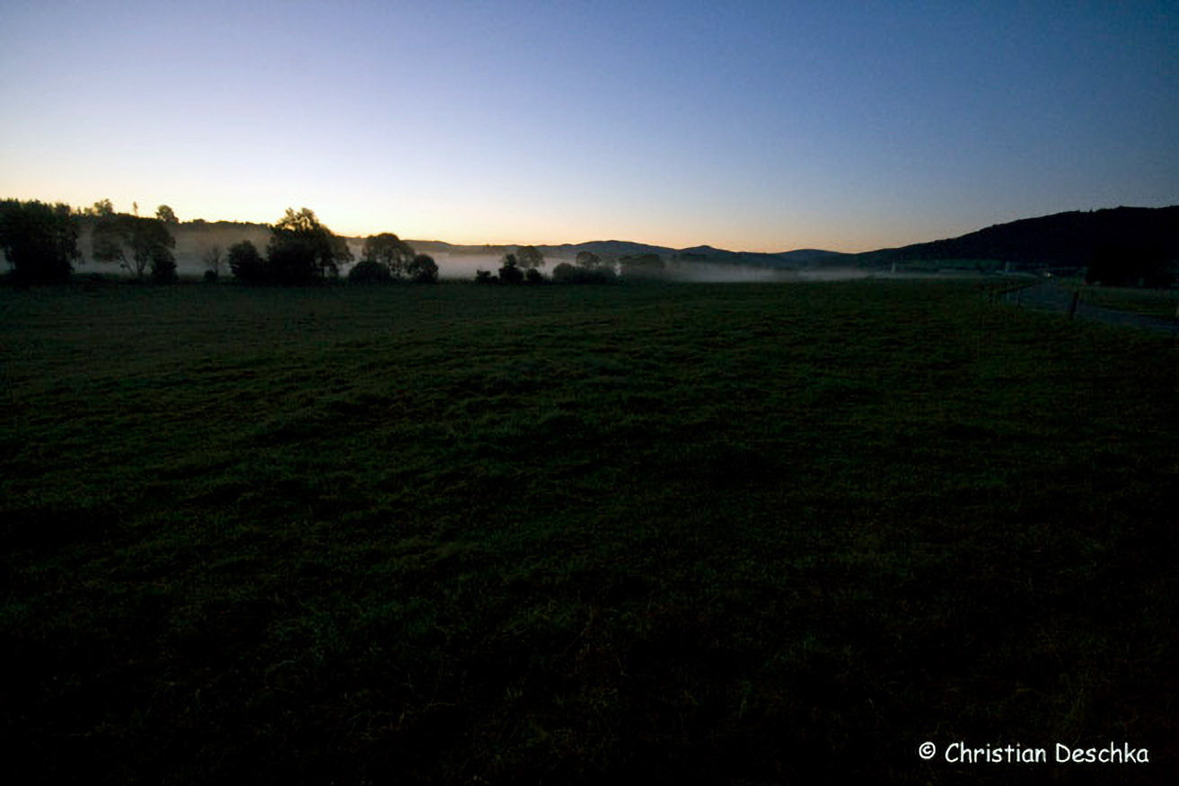 Dass sich hier im Boden das Wasser dem undurchdringlichen Untergrund folgend nach Norden und Süden aufteilt, wird durch einen Brunnen am Straßenrand angedeutet. Einige Kilometer östlich von dieser Stelle ...