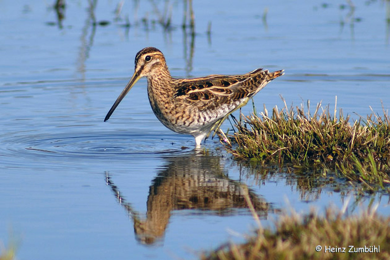 In den Uferwiesen brütet beispielsweise die Bekassine. Dieser Watvogel hat als Anpassung an seinen Flachwasser-Lebensraum lange Beine und einen pinzettenartigen Stocherschnabel.