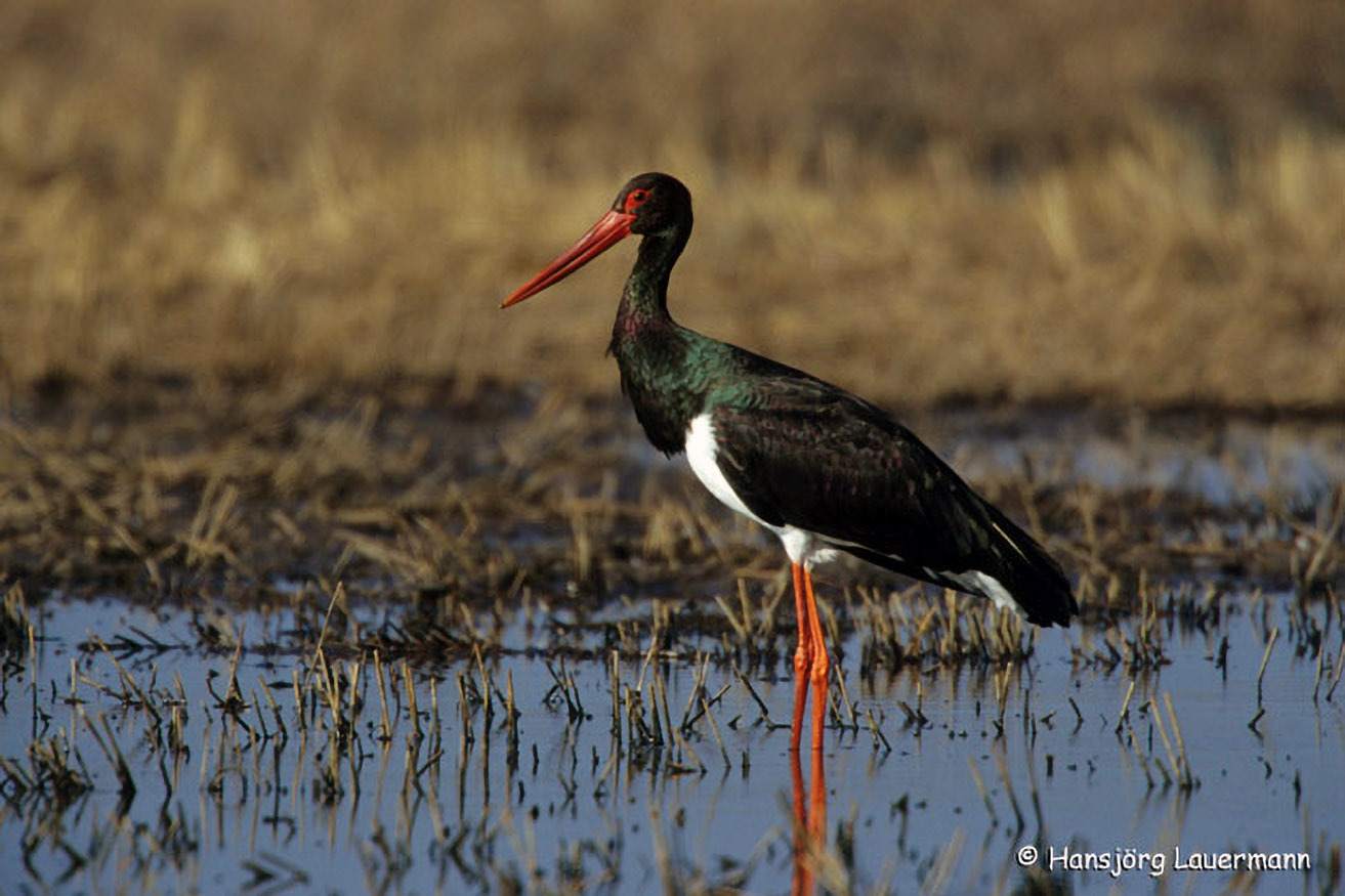Mit etwas Glück kann man in der Gegend auch den seltenen und scheuen Schwarzstorch auf der Suche nach Beute beobachten.