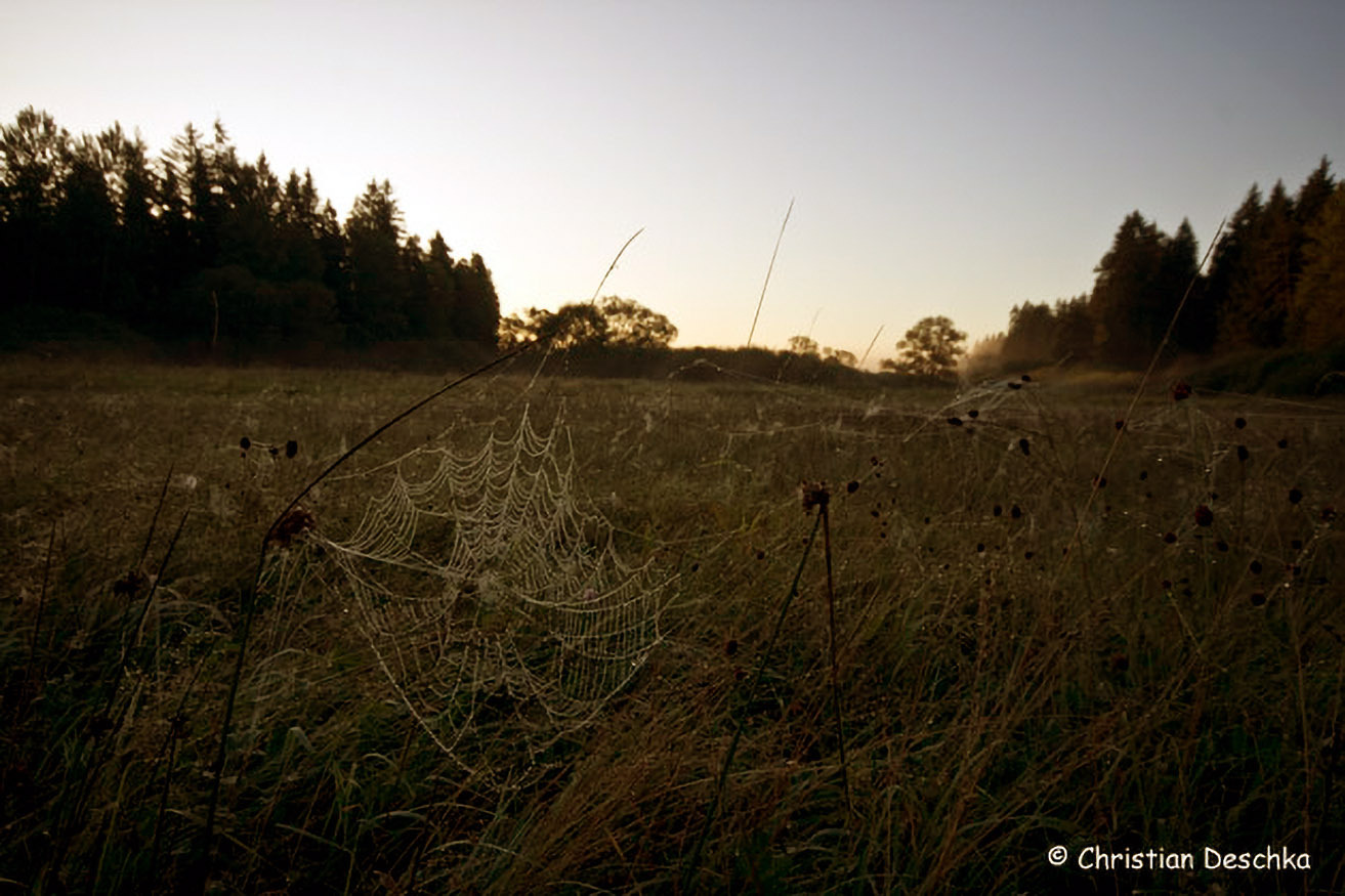 Die Feuchtwiesen beherbergen aber auch eine erstaunliche Vielfalt an Wirbellosen. In der Früh findet man überall taubehangene Spinnennetze.