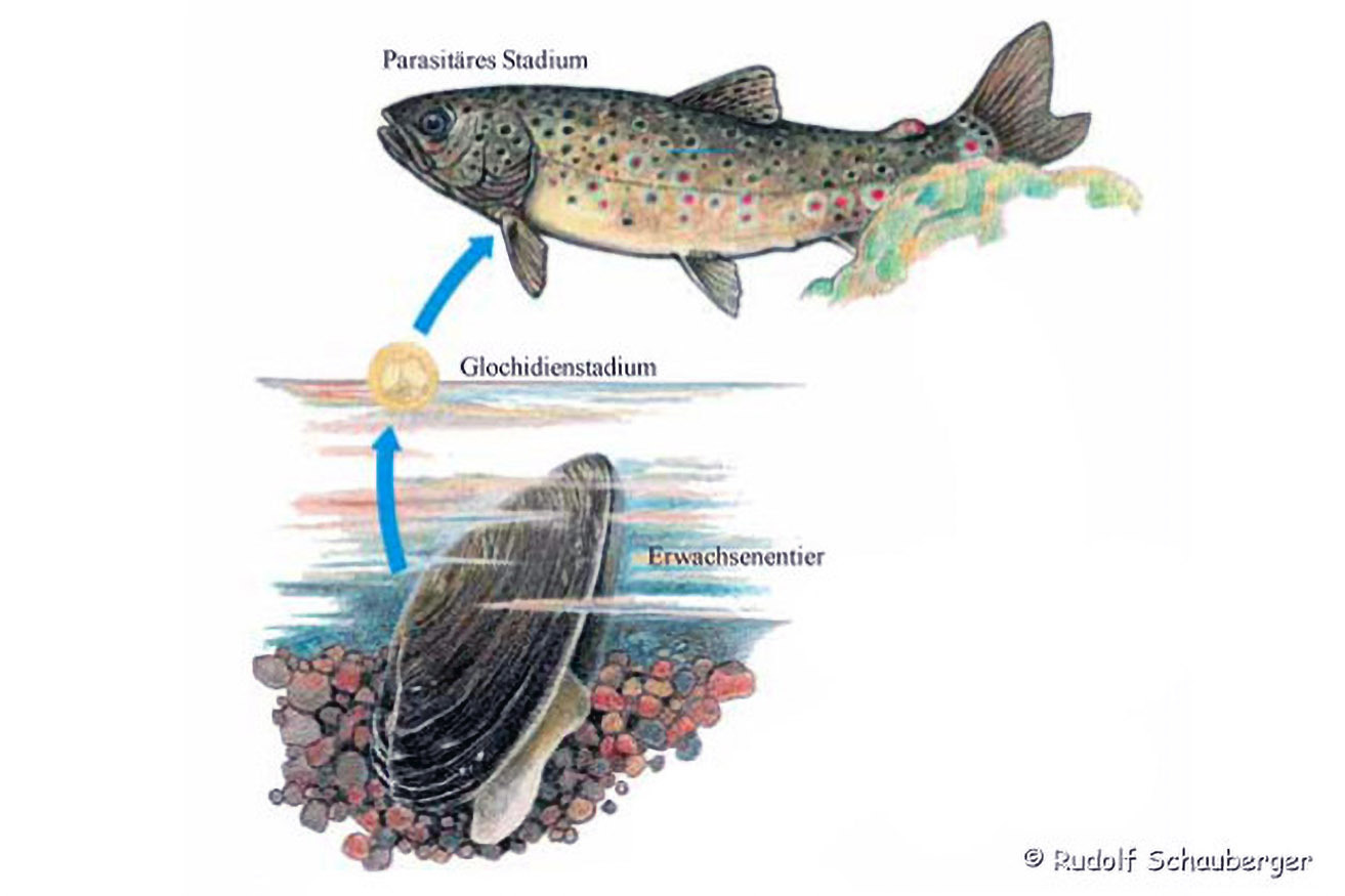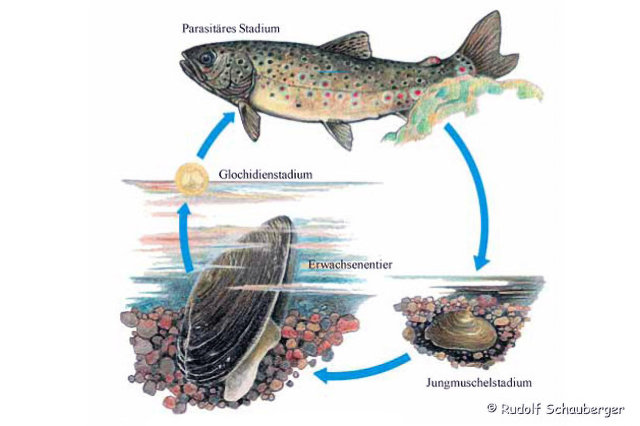 Die gerne in Kolonien ("Muschelbänken") lebende Flussperlmuschel hat einen komplizierten Fortpflanzungszyklus: Erwachsene Tiere geben im Spätsommer Larven (Glochidien) ins Wasser ab, die sich als Parasiten in den Kiemen von Bachforellen festsetzen.
