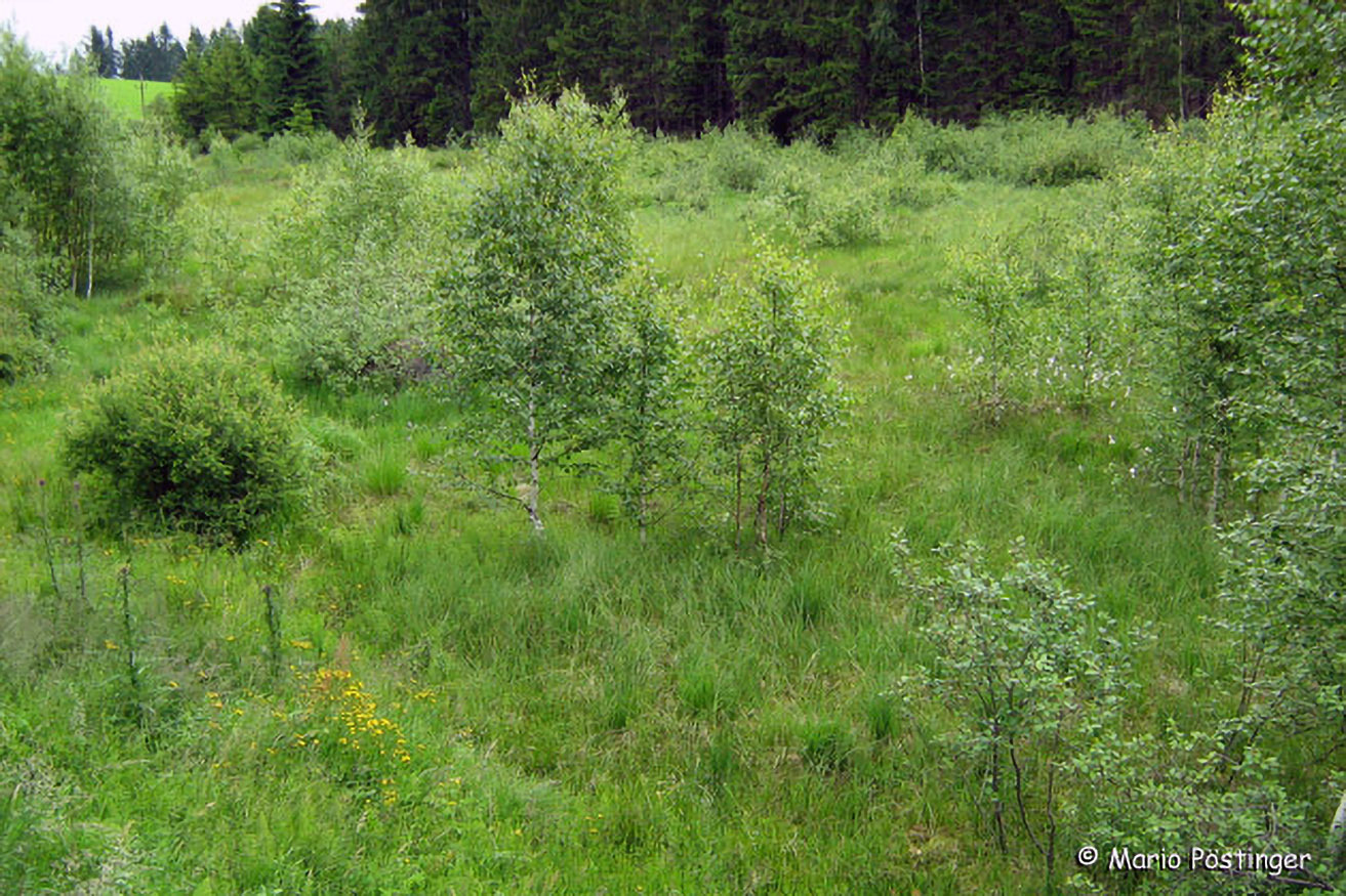 Mit der Aufgabe der Mahd setzt hingegen rasch eine Verbuschung der Moorwiese ein und die Artenvielfalt geht zurück. Laubgehölze wie Birke und Faulbaum nehmen überhand und entziehen dem Torfkörper durch ihre Verdunstungsleistung zusätzlich Wasser.