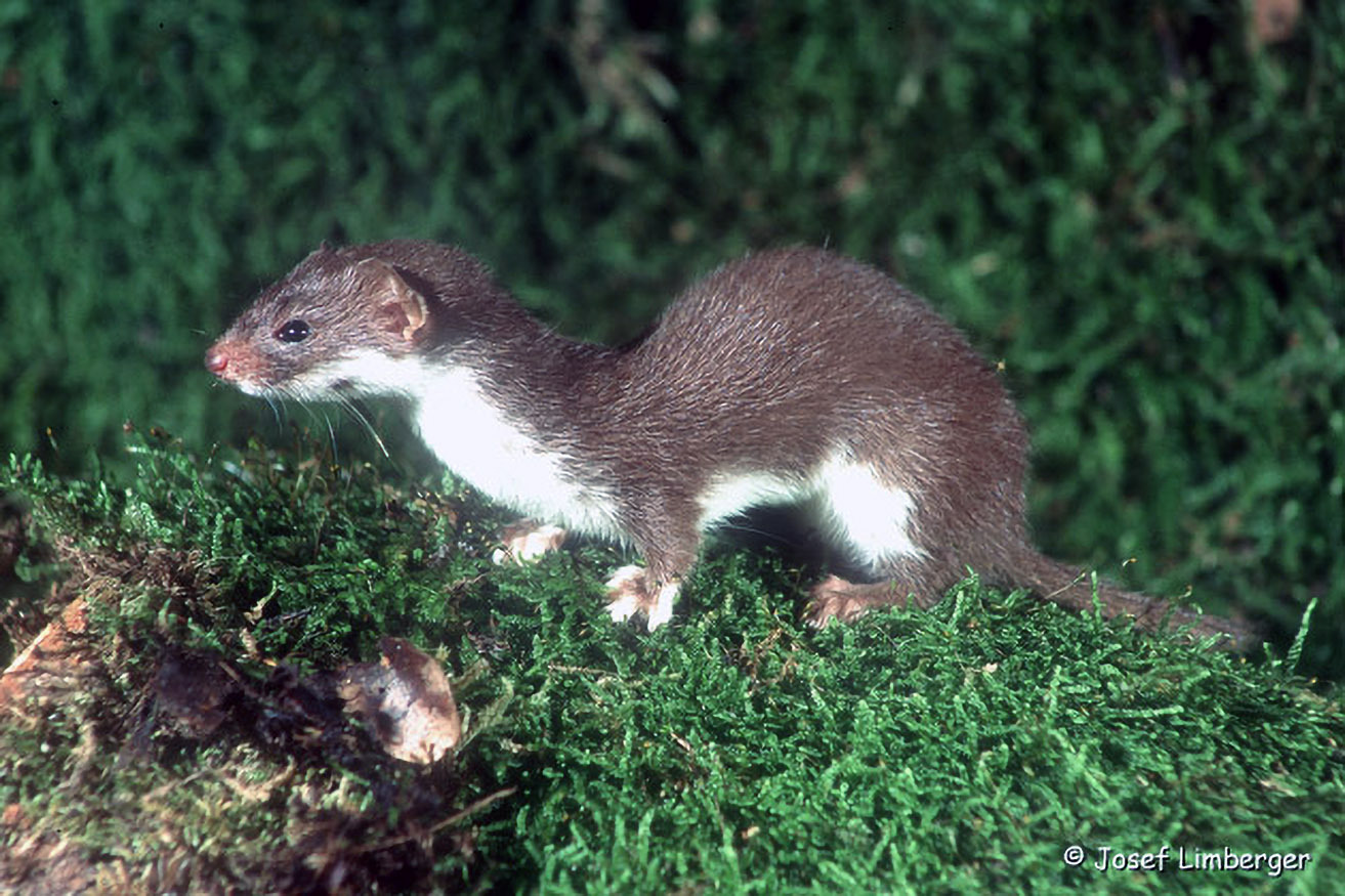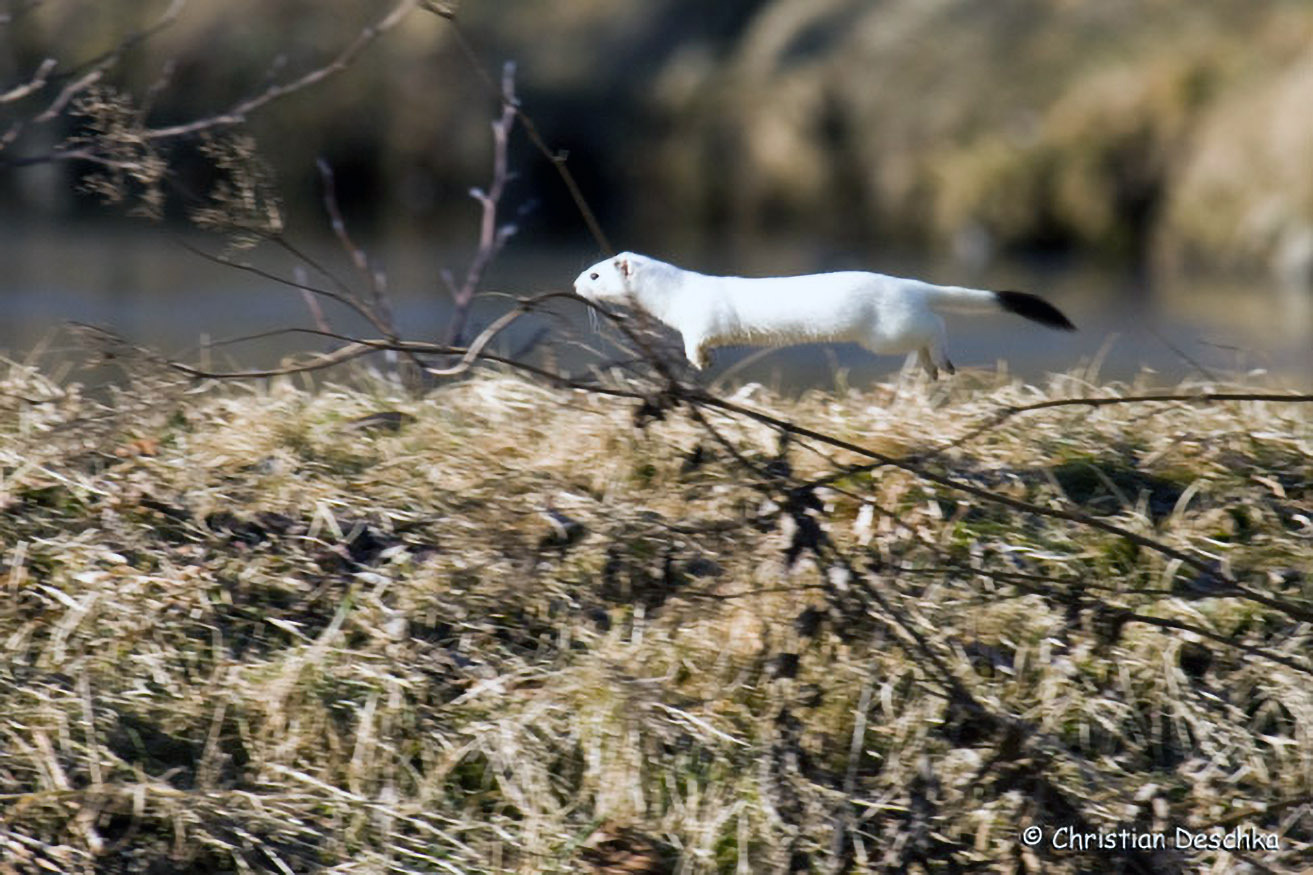 Das Hermelin ist eine kleines, längliches Raubtier. Im Winterhalbjahr ist es bis auf die schwarze Rutenspitze weiß gefärbt. Als flinker Jäger erbeutet es vor allem Wühlmäuse. Zwischen einzelnen Sprints macht es meist kurz Männchen.