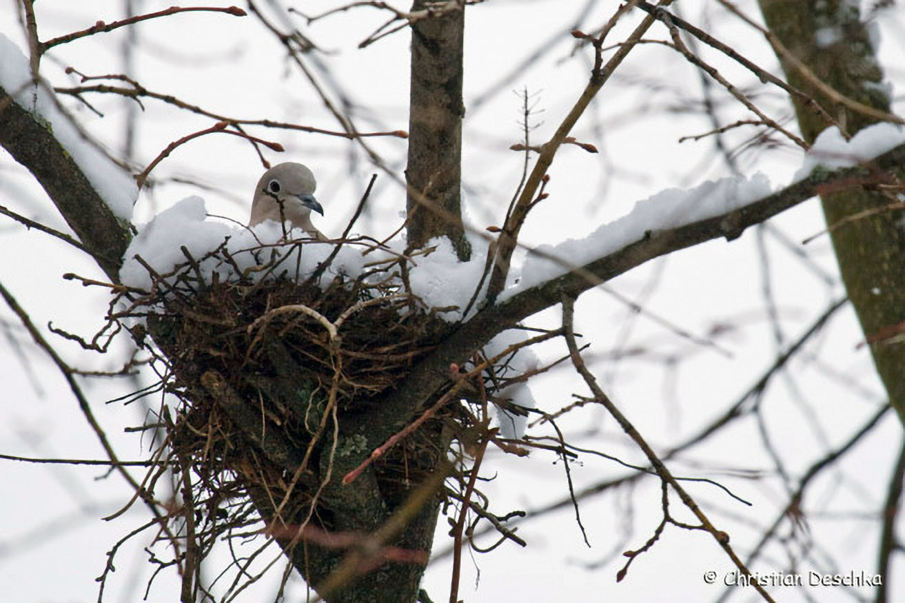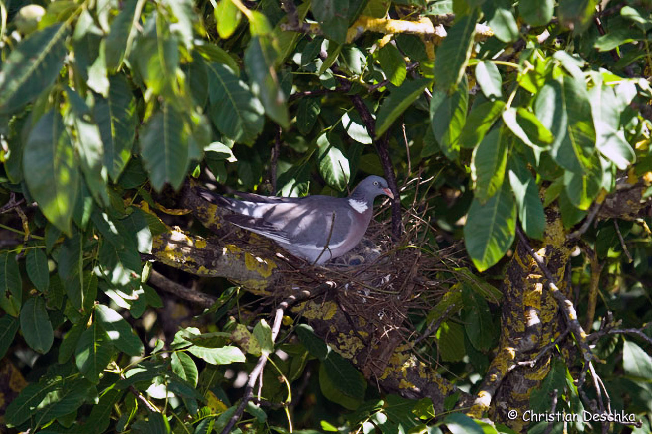 Die Ringeltaube brütete früher ausschließlich im Wald. In den letzten Jahren ist aber eine „Verstädterung“ zu beobachten. Das bedeutet, dass diese Wildart zunehmend im Umfeld des Menschen brütet. In diesem Fall auf einem Nussbaum im Garten.