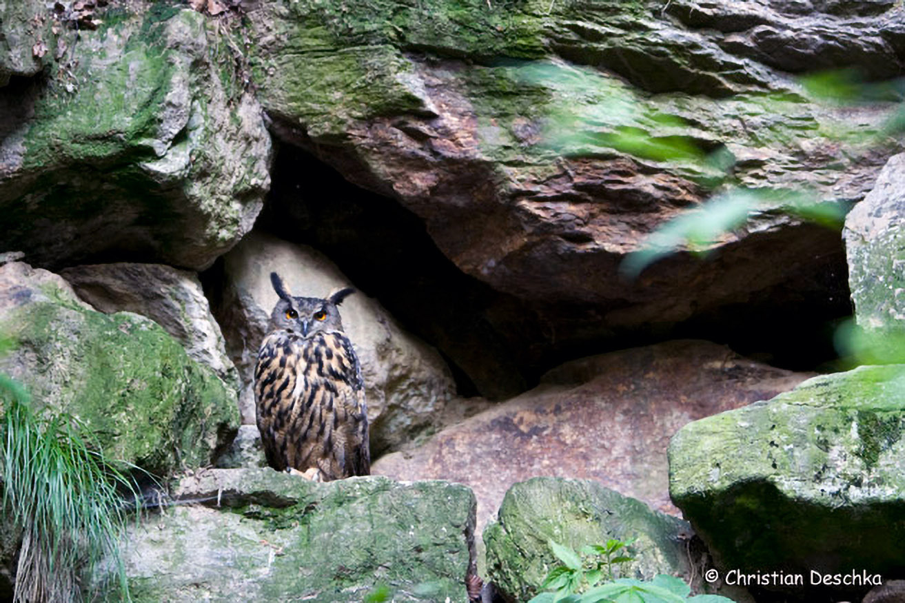 Der Name des Uhus geht auf seine Rufe zurück. Diese größte heimische Eule brütet am liebsten in natürlichen Felsen sowie in Steinbrüchen. Manchmal kratzt er seine Nestmulde auch einfach an der Basis eines Baumes aus.