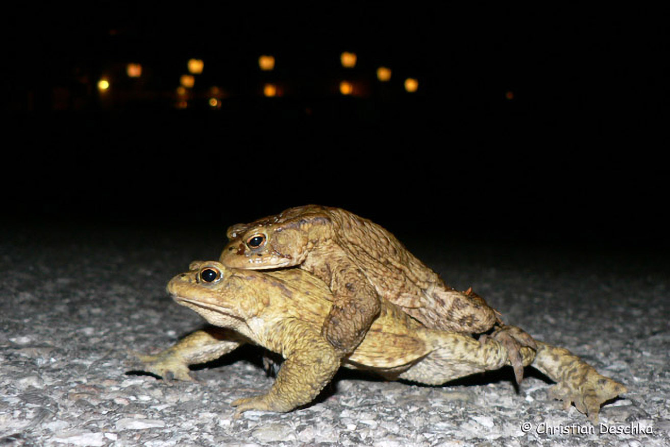 Die Erdkröte ist im zeitigen Frühling am auffälligsten. Dann wandern manchmal mehrere hundert Tiere zu stehenden Gewässern, um dort in Form von Schnüren abzulaichen. Leider sind die Wanderwege heute oft von todbringenden Straßen durchzogen.